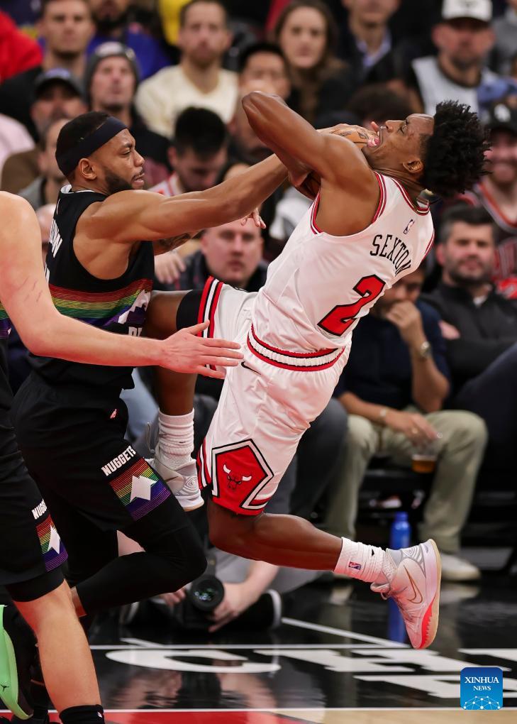 Chicago Bulls' Collin Sexton (R) is defended by Denver Nuggets' Bruce Brown during the NBA regular season game between Denver Nuggets and Chicago Bulls at United Center in Chicago, the United States, Feb. 7, 2026. (Photo by Joel Lerner/Xinhua)