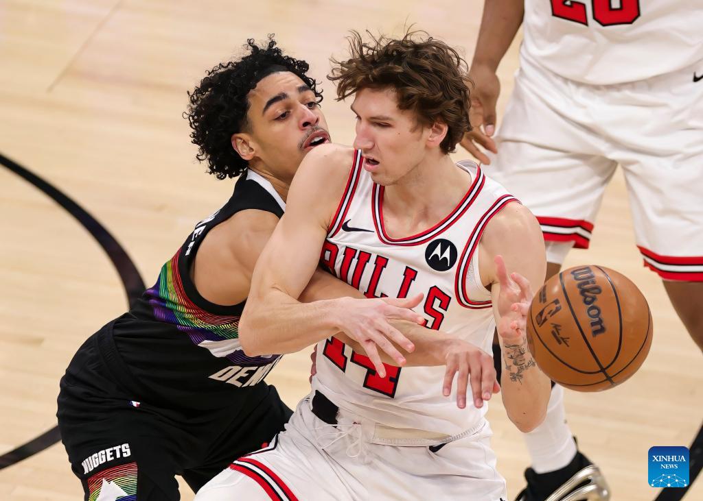 Denver Nuggets' Julian Strawther (L) defends Chicago Bulls' Matas Buzelis during the NBA regular season game between Denver Nuggets and Chicago Bulls at United Center in Chicago, the United States, Feb. 7, 2026. (Photo by Joel Lerner/Xinhua)
