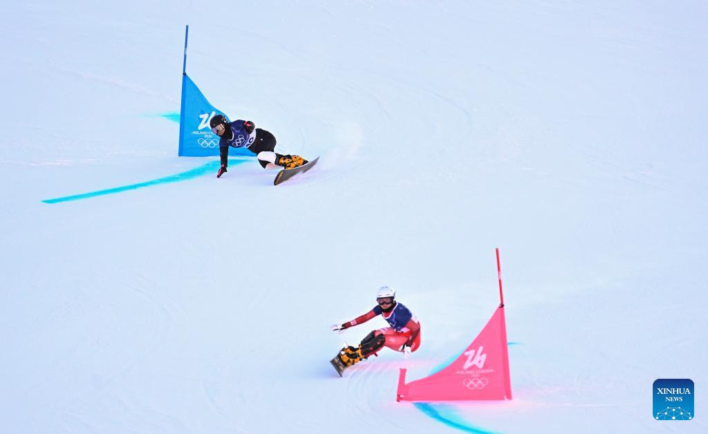 Xenia von Siebenthal (R) of Switzerland and Dong Yuyue of China compete during the Snowboard Women's Parallel Giant Slalom Qualification at the Milan-Cortina 2026 Olympic Winter Games in Livigno, Italy, Feb. 8, 2026. (Xinhua/Zhang Hongxiang)