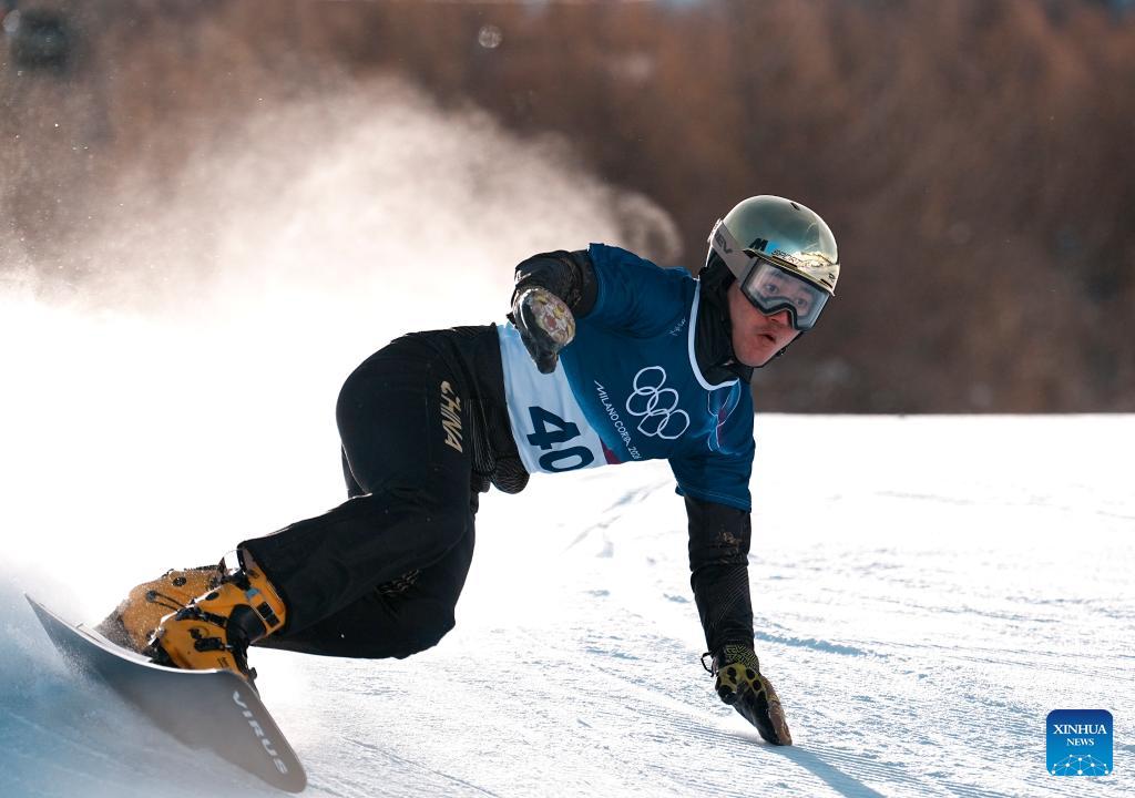 Ban Xuefu of China competes during the Snowboard Men's Parallel Giant Slalom Qualification at the Milan-Cortina 2026 Olympic Winter Games in Livigno, Italy, Feb. 8, 2026. (Xinhua/Hu Chao)