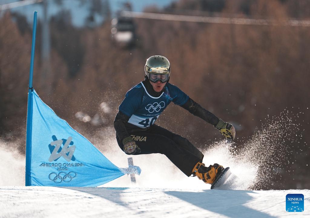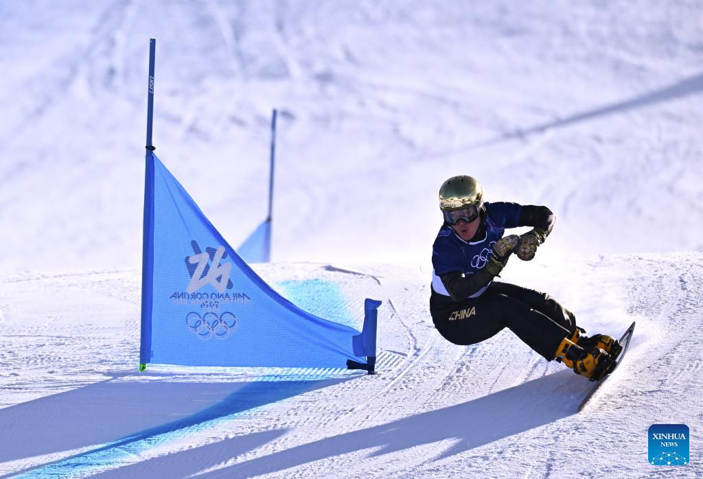 Bi Ye of China competes during the Snowboard Men's Parallel Giant Slalom Qualification at the Milan-Cortina 2026 Olympic Winter Games in Livigno, Italy, Feb. 8, 2026. (Xinhua/Zhang Hongxiang)