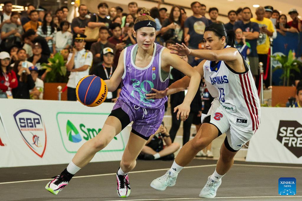 Sroifa Phetnin (C) of CT Tigers of Thailand vies against players from Uratex Dream of the Philippines during the semifinal match between CT Tigers of Thailand and Uratex Dream of the Philippines at the Manila Hustle Philippine Women's 3x3 International Invitational in Pasay City, the Philippines, Feb. 8, 2026. (Xinhua/Rouelle Umali)