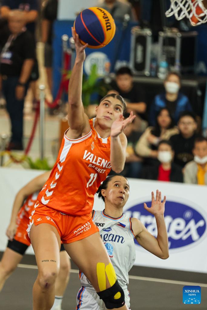 Frida Cecchi (L) of Valencia Basket Club 3x3 goes for a layup during the quarterfinal between Uratex Dream of the Philippines and Valencia Basket Club 3x3 of Spain at the Manila Hustle Philippine Women's 3x3 International Invitational in Pasay City, the Philippines, Feb. 8, 2026. (Xinhua/Rouelle Umali)