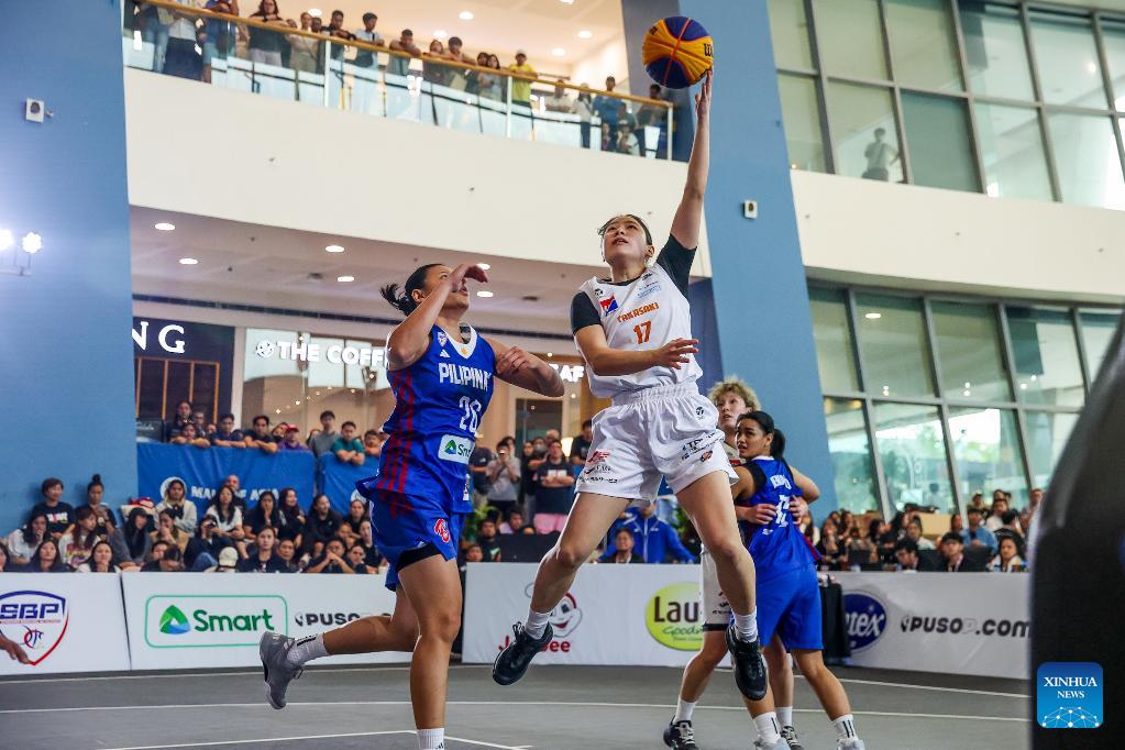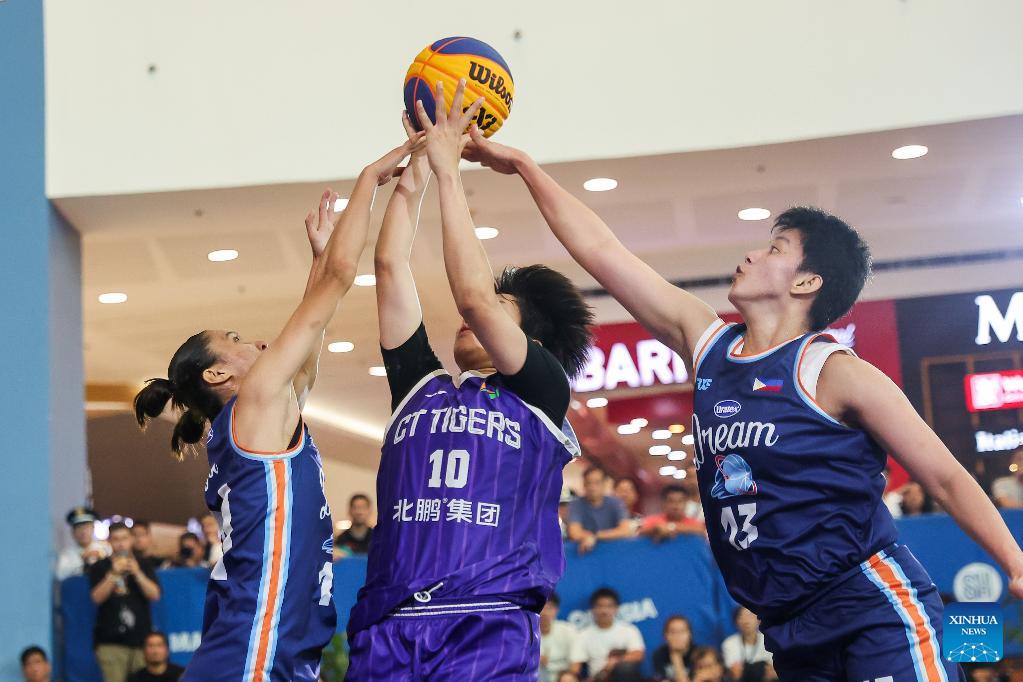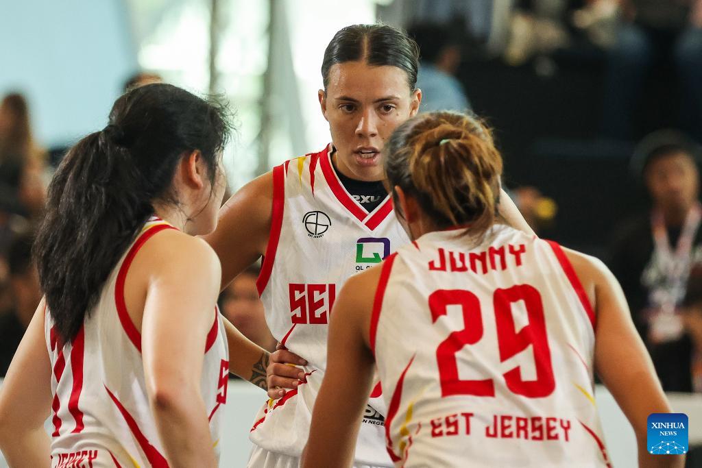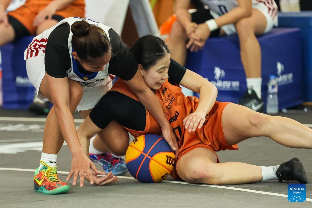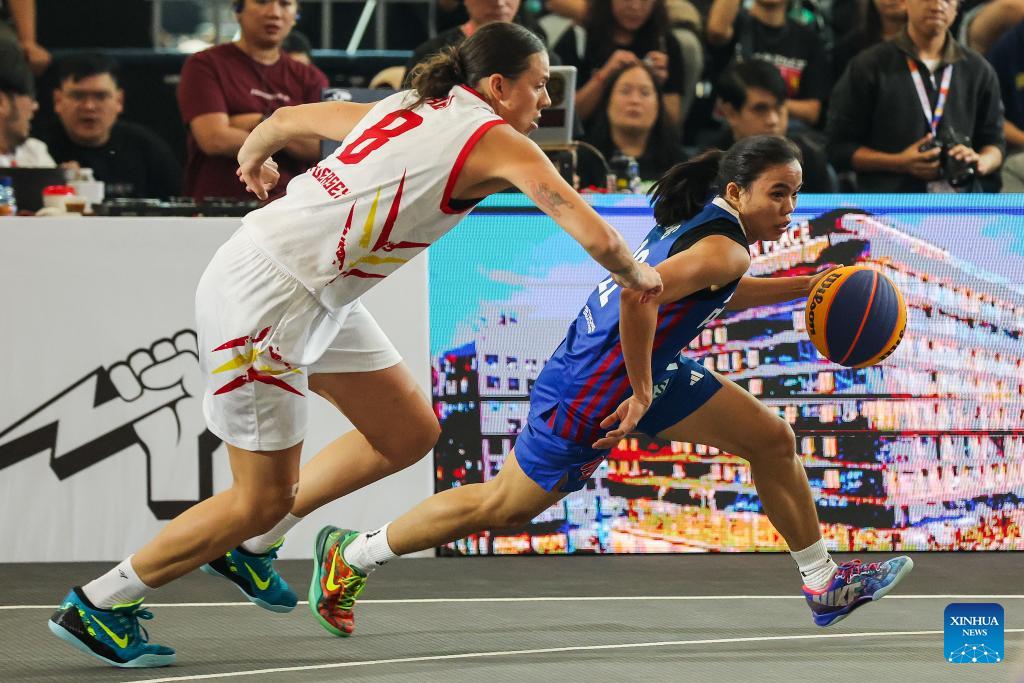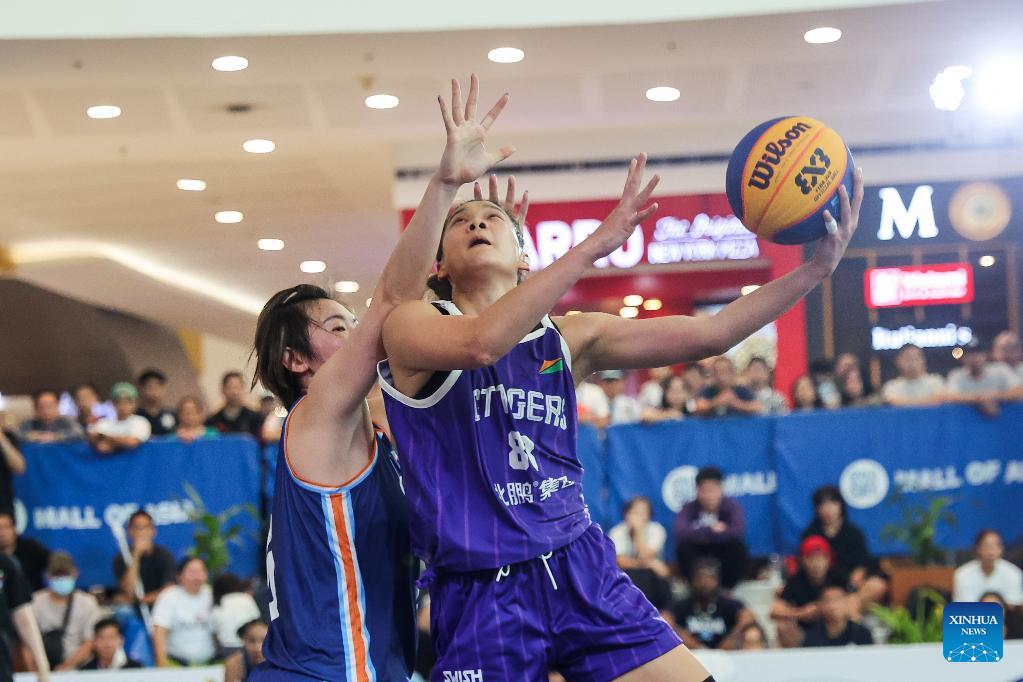 Players of Selangor Est Jersey of Malaysia are seen as they compete during the pre-quarterfinal match between the Gilas Pilipinas Stars of the Philippines and Selangor Est Jersey of Malaysia at the Manila Hustle Philippine Women's 3x3 International Invitational in Pasay City, the Philippines, Feb. 8, 2026. (Xinhua/Rouelle Umali)