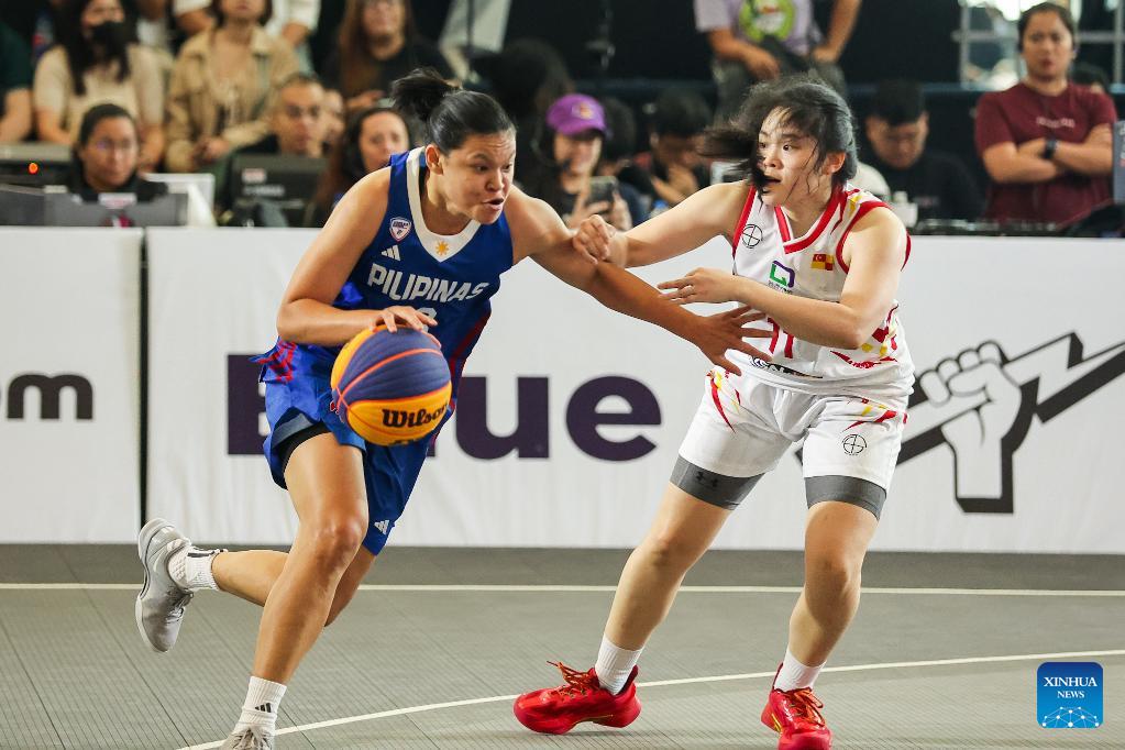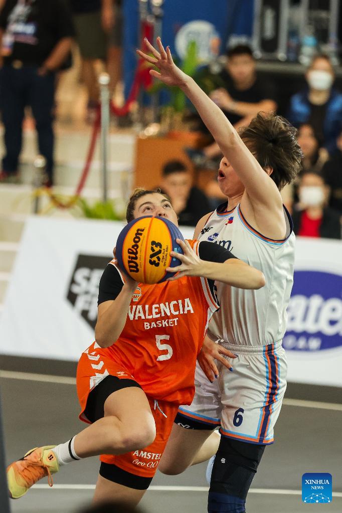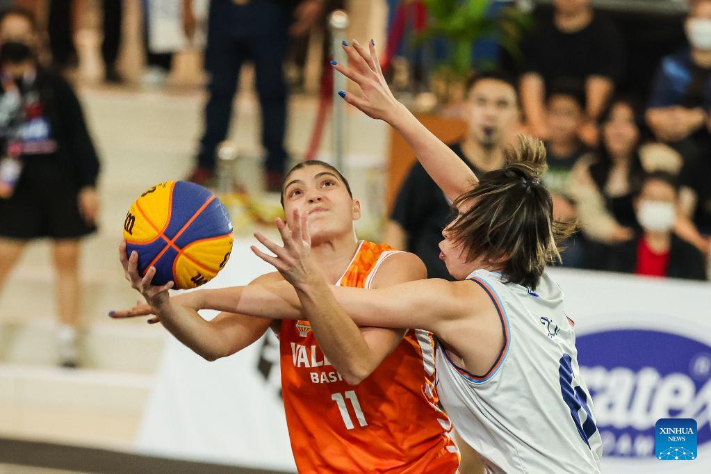 Carmen Segura Moreno (L) of Valencia Basket Club 3x3 competes against Li Renzhu (R) of Uratex Dream during the quarterfinal between Uratex Dream of the Philippines and Valencia Basket Club 3x3 of Spain at the Manila Hustle Philippine Women's 3x3 International Invitational in Pasay City, the Philippines, Feb. 8, 2026. (Xinhua/Rouelle Umali)
