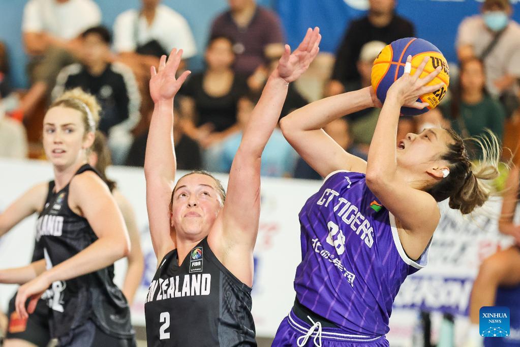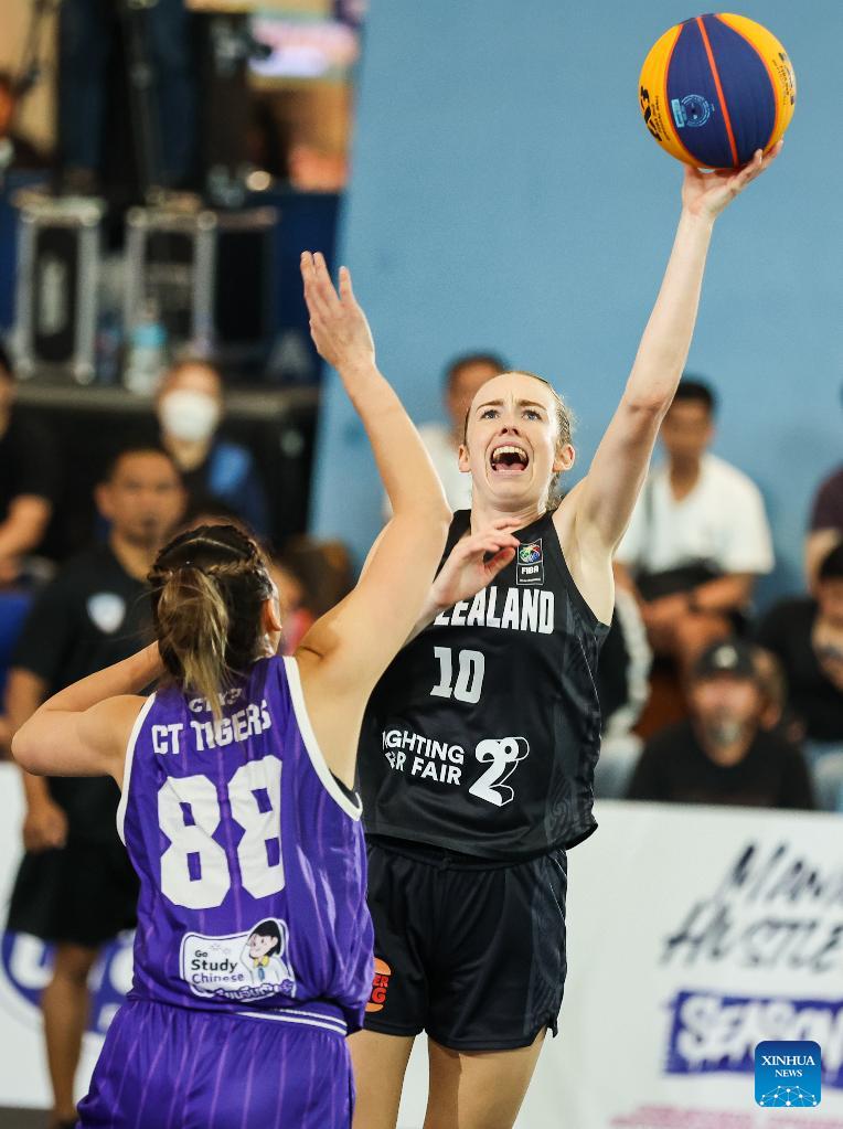 Lauryn Hippolite (C) of New Zealand National Team competes against Kwanjira Panted (R) of CT Tigers of Thailand during the quarterfinal match between CT Tigers of Thailand and New Zealand National Team at the Manila Hustle Philippine Women's 3x3 International Invitational in Pasay City, the Philippines, Feb. 8, 2026. (Xinhua/Rouelle Umali)
