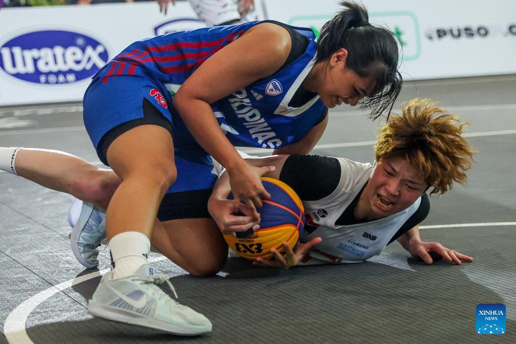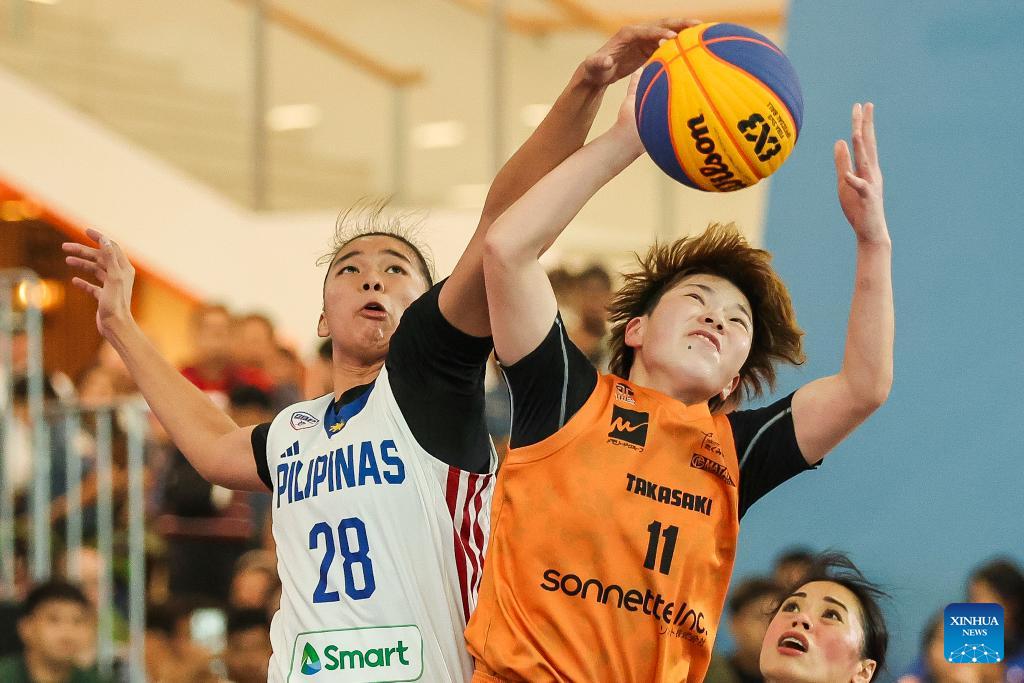 Honoka Harayama (R) of Flowlish Gunma of Japan competes against Gabi Bade of Gilas Pilipinas Suns of the Philippines during the quarterfinal match between Flowlish Gunma of Japan and Gilas Pilipinas Suns of the Philippines at the Manila Hustle Philippine Women's 3x3 International Invitational in Pasay City, the Philippines, Feb. 8, 2026. (Xinhua/Rouelle Umali)