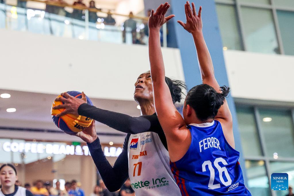 Tahira Maya (R) of Zoos Tokyo of Japan competes during the quarterfinal between Zoos Tokyo of Japan and Gilas Pilipinas Stars of the Philippines at the Manila Hustle Philippine Women's 3x3 International Invitational in Pasay City, the Philippines, Feb. 8, 2026. (Xinhua/Rouelle Umali)