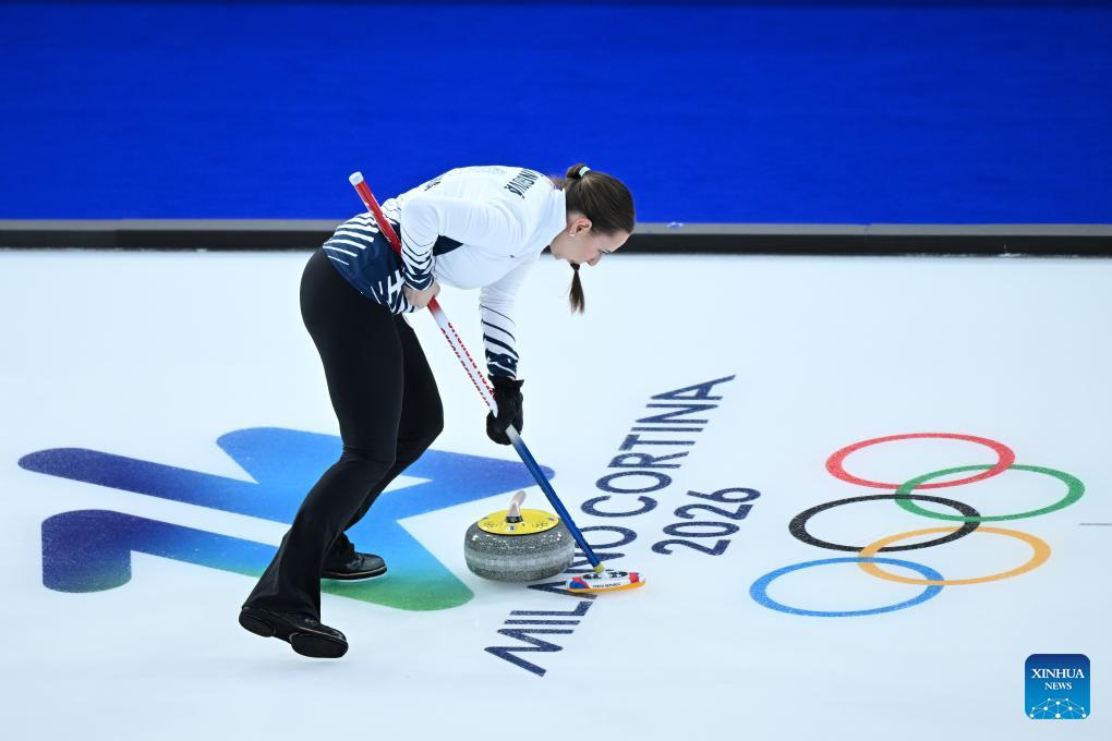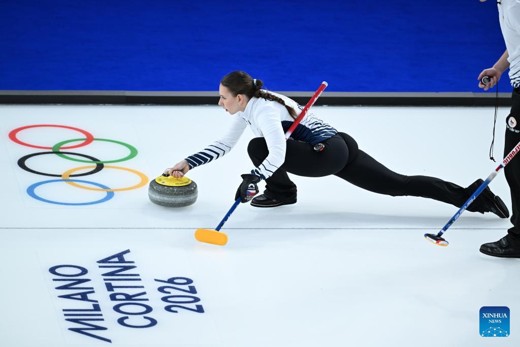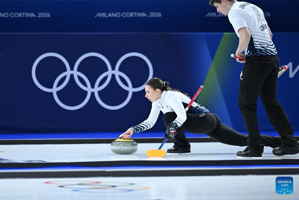 Julie Zelingrova of the Czech Republic competes against Kristin Skaslien/Magnus Nedregotten of Norway during the curling mixed doubles round robin session 10 match of the 2026 Milan-Cortina Winter Olympics in Cortina D'Ampezzo, Italy, Feb. 8, 2026. (Xinhua/Lian Yi)