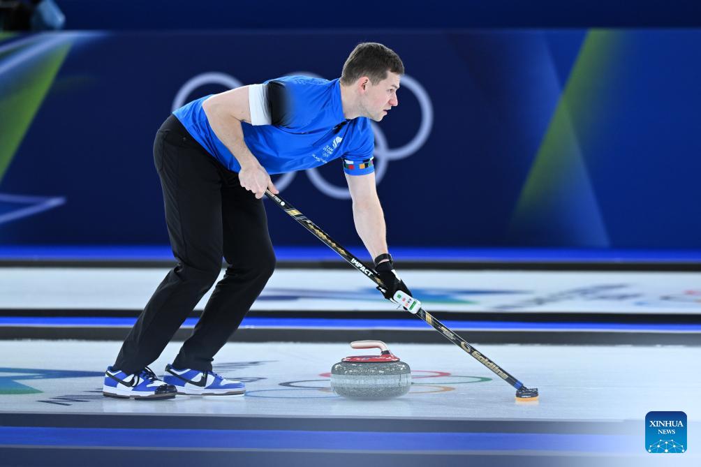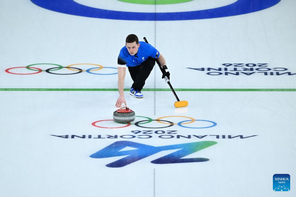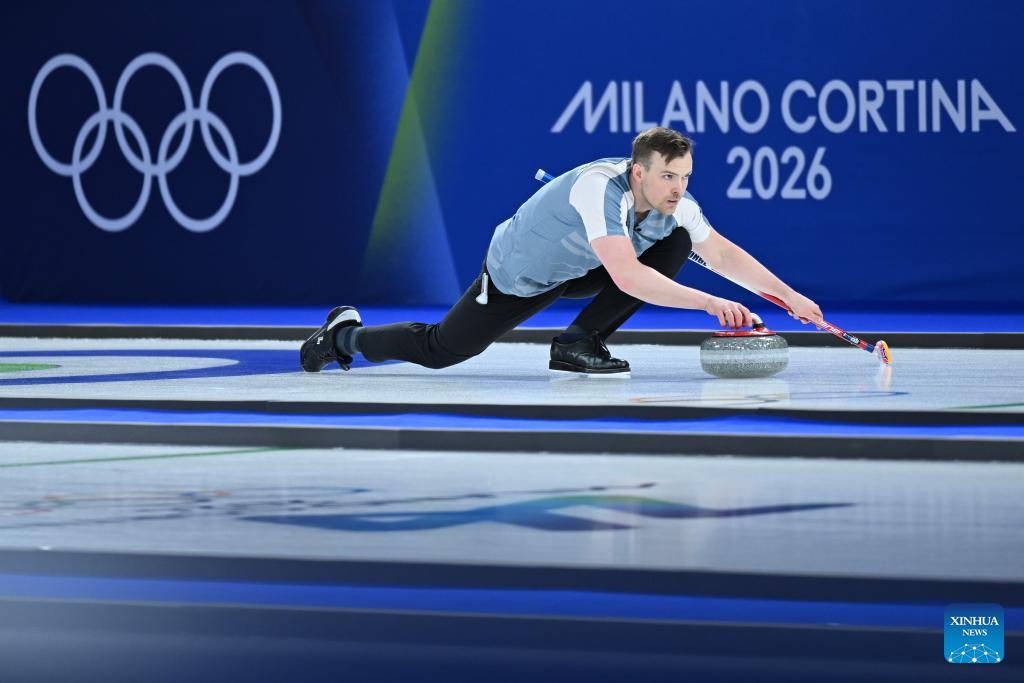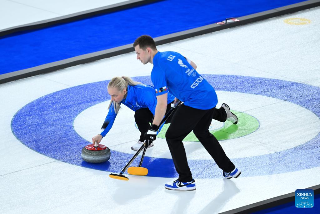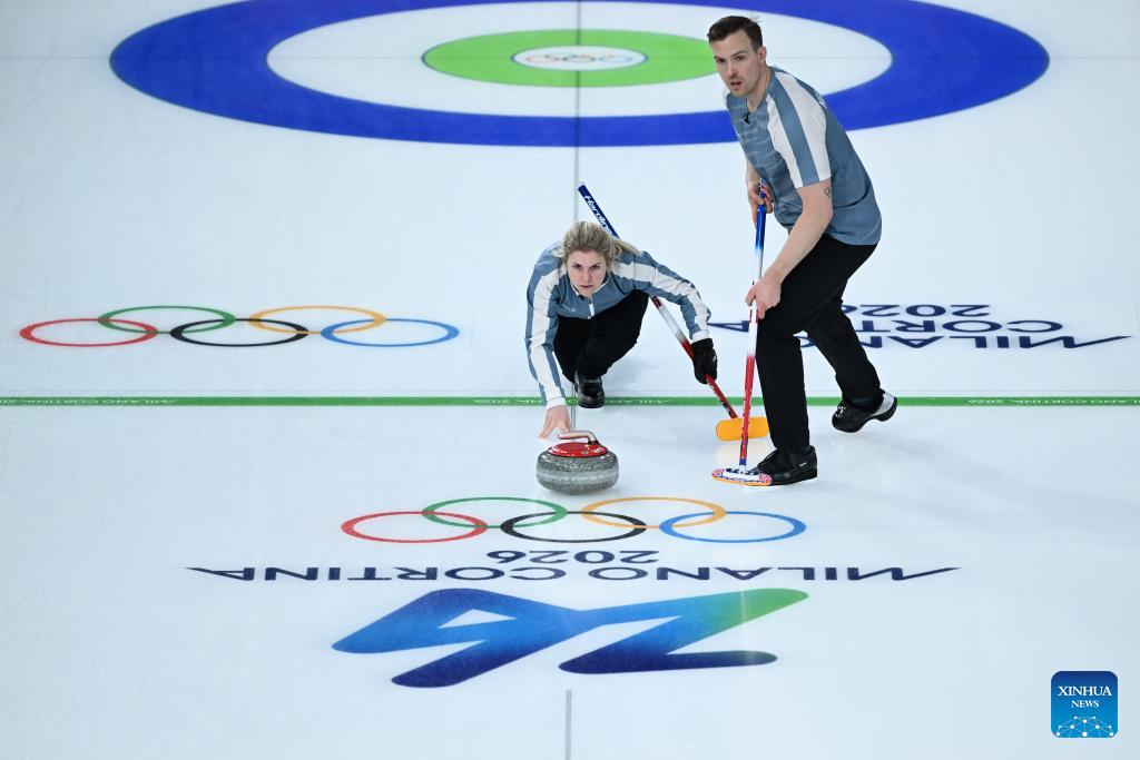 Harri Lill of Estonia competes against Kim Seon-yeong/Jeong Yeong-seok of South Korea during the curling mixed doubles round robin session 10 match of the 2026 Milan-Cortina Winter Olympics in Cortina D'Ampezzo, Italy, Feb. 8, 2026. (Xinhua/Lian Yi)