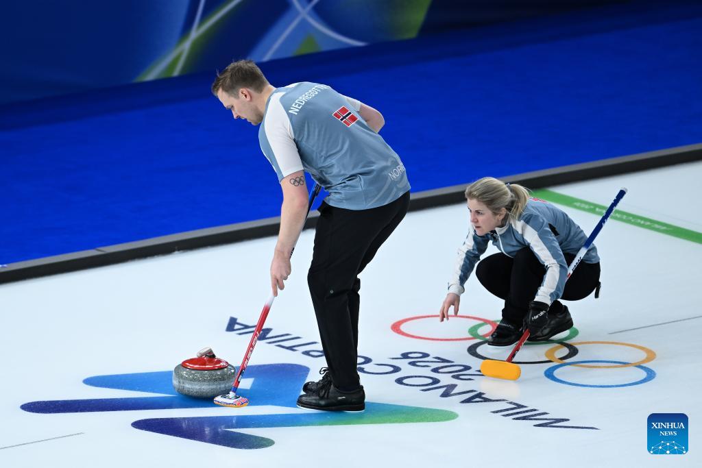 Kristin Skaslien (R)/Magnus Nedregotten of Norway compete against Julie Zelingrova/Vit Chabicovsky of the Czech Republic during the curling mixed doubles round robin session 10 match of the 2026 Milan-Cortina Winter Olympics in Cortina D'Ampezzo, Italy, Feb. 8, 2026. (Xinhua/Lian Yi)