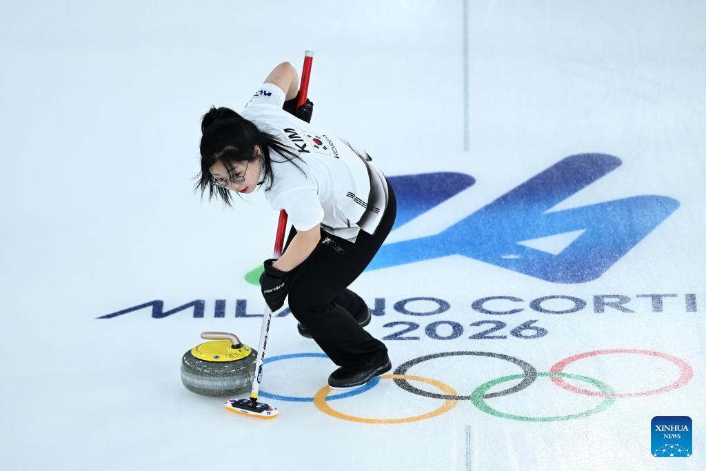 Kim Seon-yeong of South Korea competes against Marie Kaldvee/Harri Lill of Estonia during the curling mixed doubles round robin session 10 match of the 2026 Milan-Cortina Winter Olympics in Cortina D'Ampezzo, Italy, Feb. 8, 2026. (Xinhua/Lian Yi)