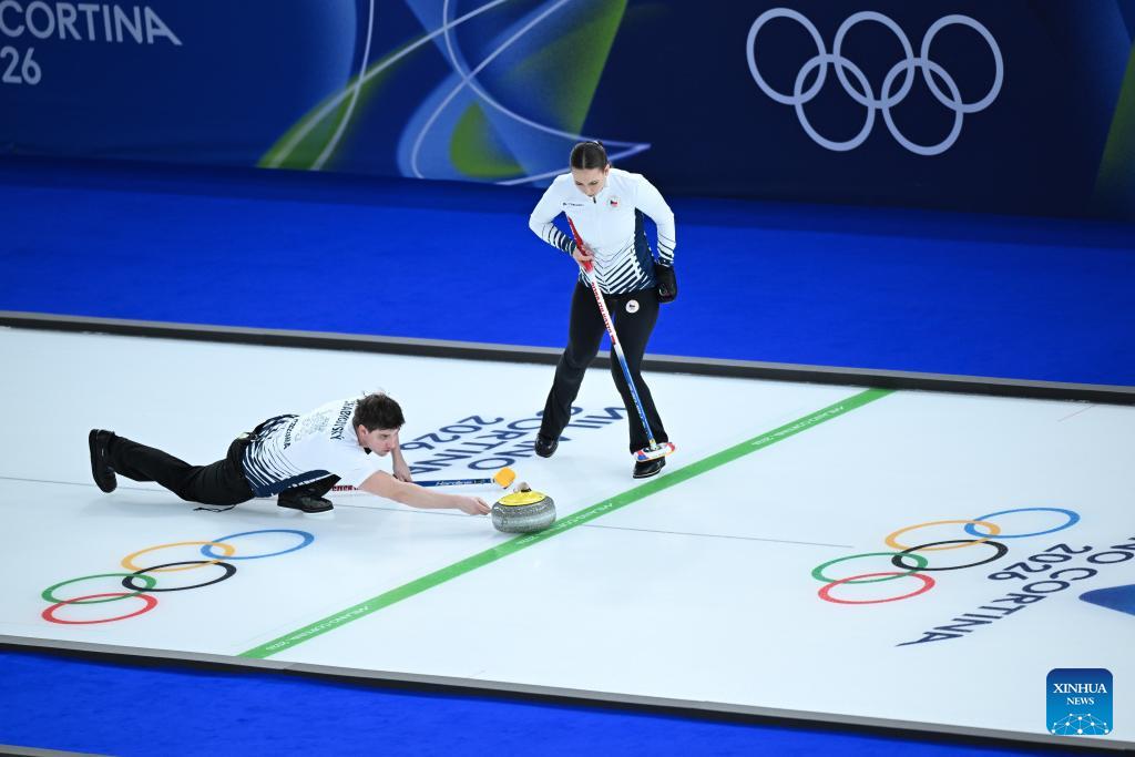 Julie Zelingrova (L)/Vit Chabicovsky of the Czech Republic compete against Kristin Skaslien/Magnus Nedregotten of Norway during the curling mixed doubles round robin session 10 match of the 2026 Milan-Cortina Winter Olympics in Cortina D'Ampezzo, Italy, Feb. 8, 2026. (Xinhua/Lian Yi)