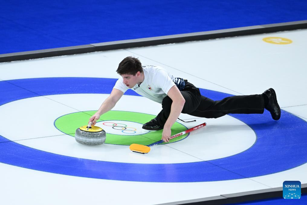 Vit Chabicovsky of the Czech Republic competes against Kristin Skaslien/Magnus Nedregotten of Norway during the curling mixed doubles round robin session 10 match of the 2026 Milan-Cortina Winter Olympics in Cortina D'Ampezzo, Italy, Feb. 8, 2026. (Xinhua/Lian Yi)