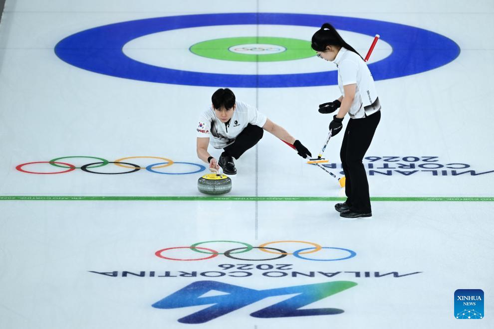 Kim Seon-yeong/Jeong Yeong-seok (L) of South Korea compete against Marie Kaldvee/Harri Lill of Estonia during the curling mixed doubles round robin session 10 match of the 2026 Milan-Cortina Winter Olympics in Cortina D'Ampezzo, Italy, Feb. 8, 2026. (Xinhua/Lian Yi)