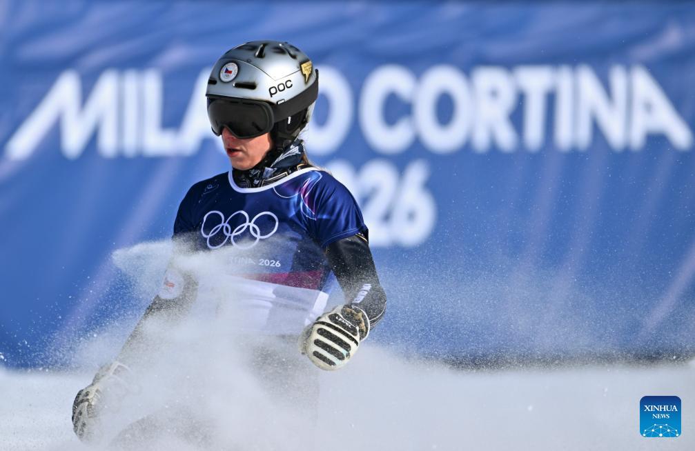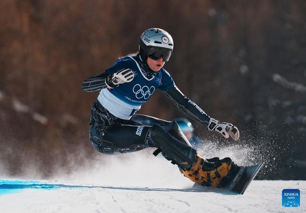Ester Ledecka of the Czech Republic competes during the Snowboard Women's Parallel Giant Slalom 1/8 Finals at the Milan-Cortina 2026 Olympic Winter Games in Livigno, Italy, Feb. 8, 2026. (Xinhua/Hu Chao)