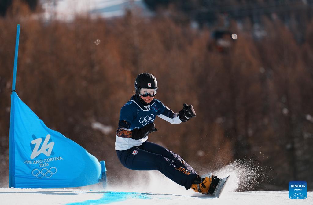Japan's Miki Tsubaki competes during the Snowboard Women's Parallel Giant Slalom 1/8 Finals at the Milan-Cortina 2026 Olympic Winter Games in Livigno, Italy, Feb. 8, 2026. (Xinhua/Hu Chao)