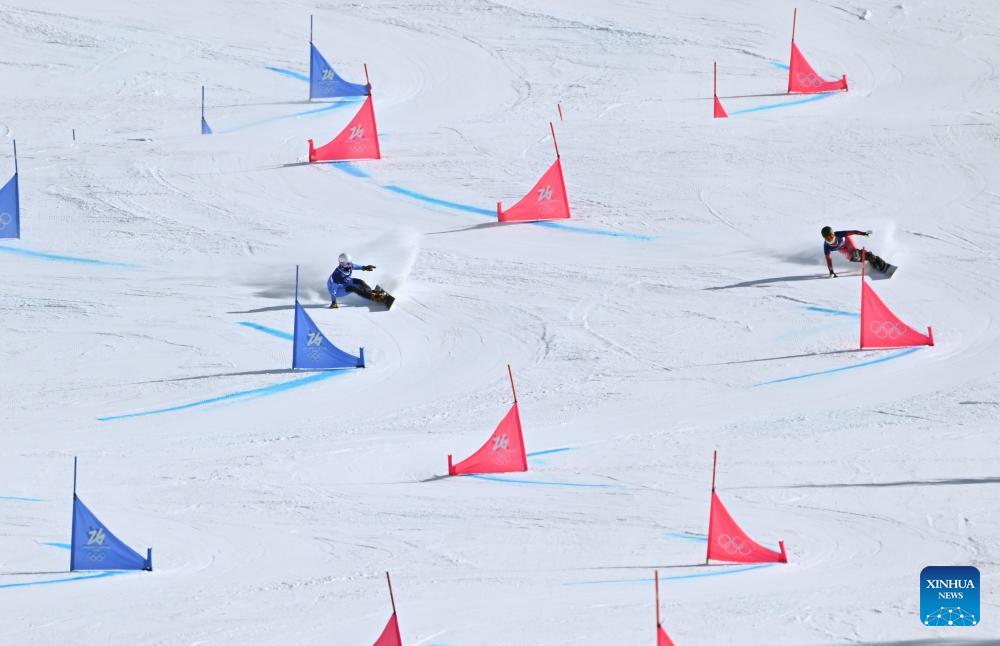 Elisa Caffont (L) of Italy competes during the Snowboard Women's Parallel Giant Slalom 1/8 Finals at the Milan-Cortina 2026 Olympic Winter Games in Livigno, Italy, Feb. 8, 2026. (Xinhua/Zhang Hongxiang)