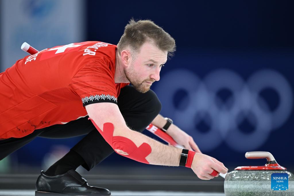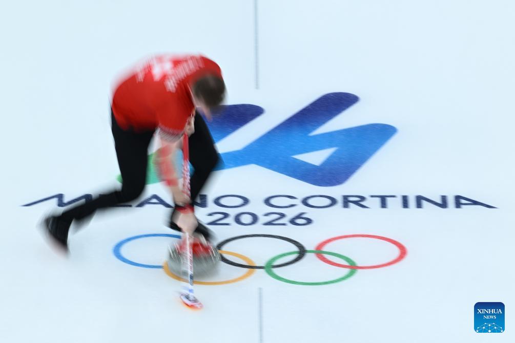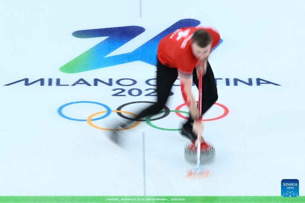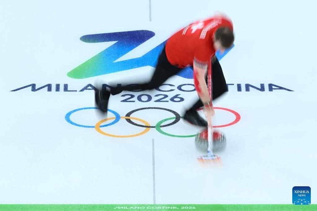 Yannick Schwaller of Switzerland competes during the curling mixed doubles round robin session 12 match between Switzerland and Norway at the Milan-Cortina 2026 Olympic Winter Games in Cortina, Italy, Feb. 8, 2026. (Xinhua/Lian Yi)