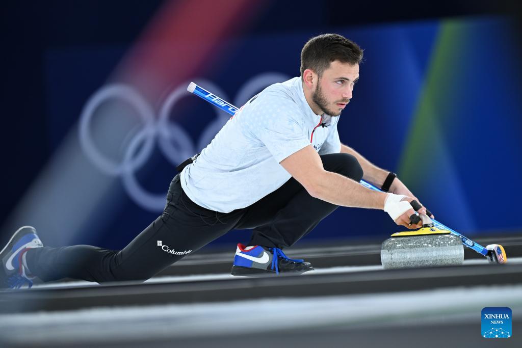Korey Dropkin of the United States competes during the curling mixed doubles round robin session 12 match between Sweden and the United States at the Milan-Cortina 2026 Olympic Winter Games in Cortina, Italy, Feb. 8, 2026. (Xinhua/Lian Yi)