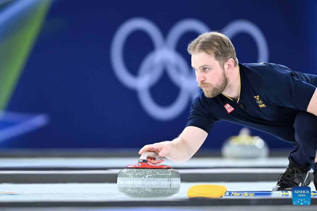 Rasmus Wranaa of Sweden competes during the curling mixed doubles round robin session 12 match between Sweden and the United States at the Milan-Cortina 2026 Olympic Winter Games in Cortina, Italy, Feb. 8, 2026. (Xinhua/Lian Yi)