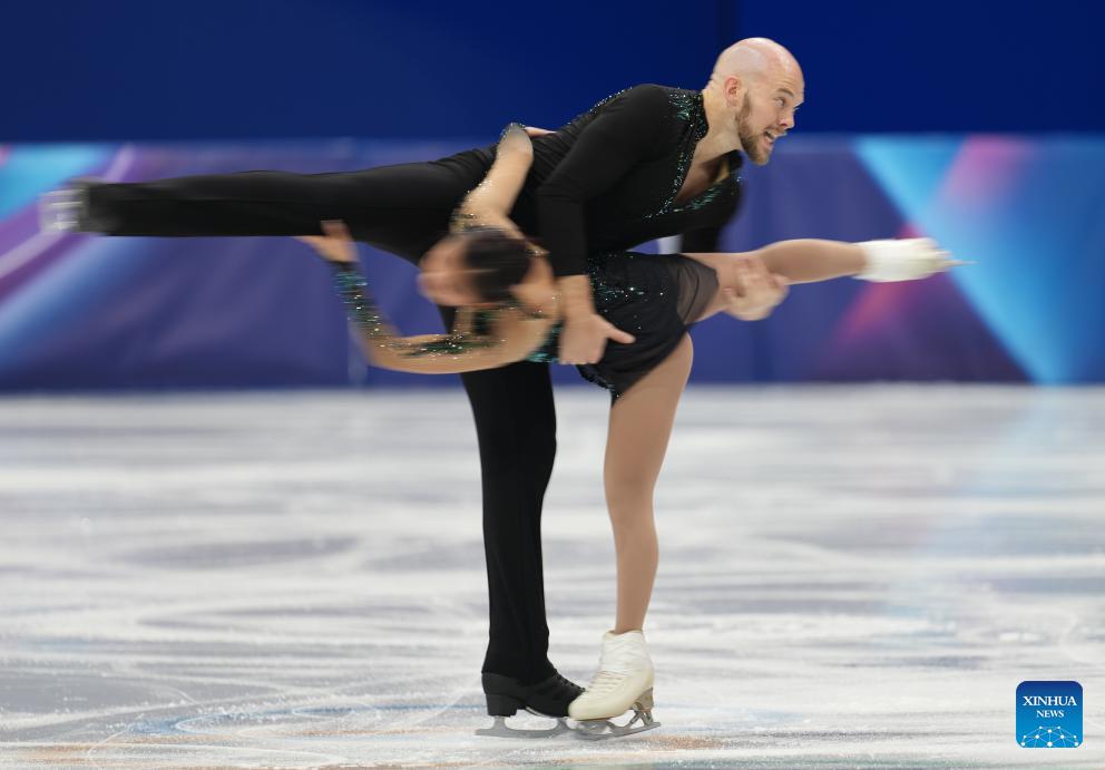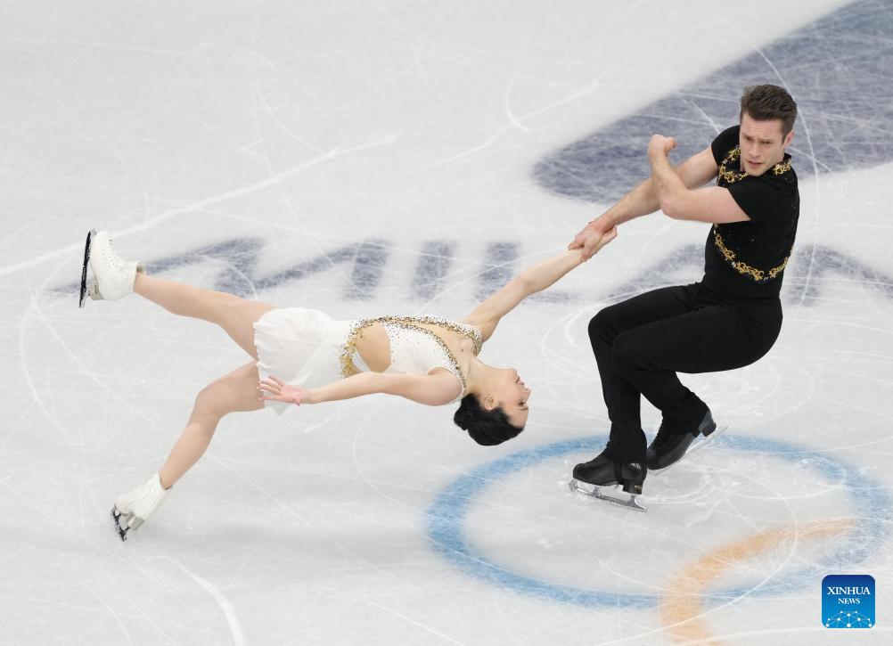 Ellie Kam (R)/Danny O'Shea of the United States perform during the figure skating team event pair skating free skating of the Milan-Cortina 2026 Olympic Winter Games in Milan, Italy, Feb. 8, 2026. (Xinhua/Xue Yuge)