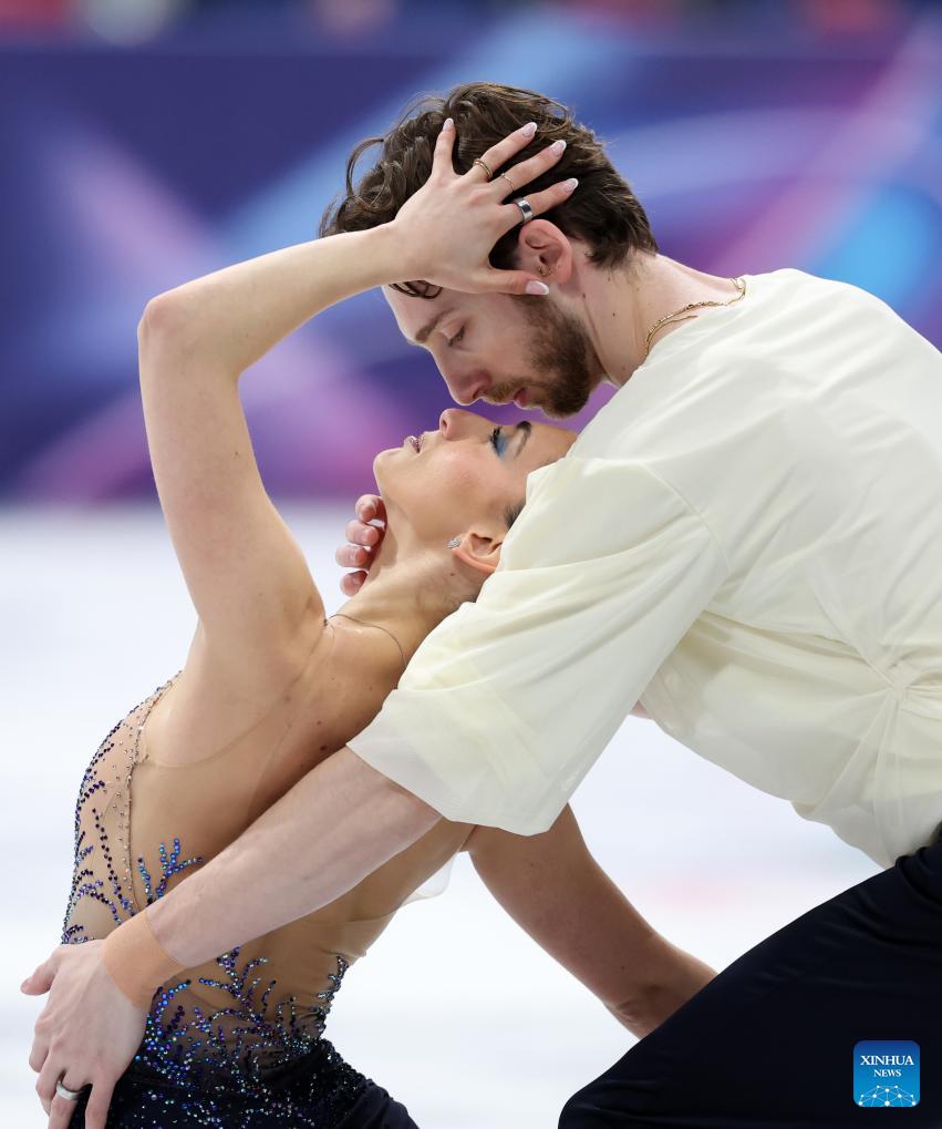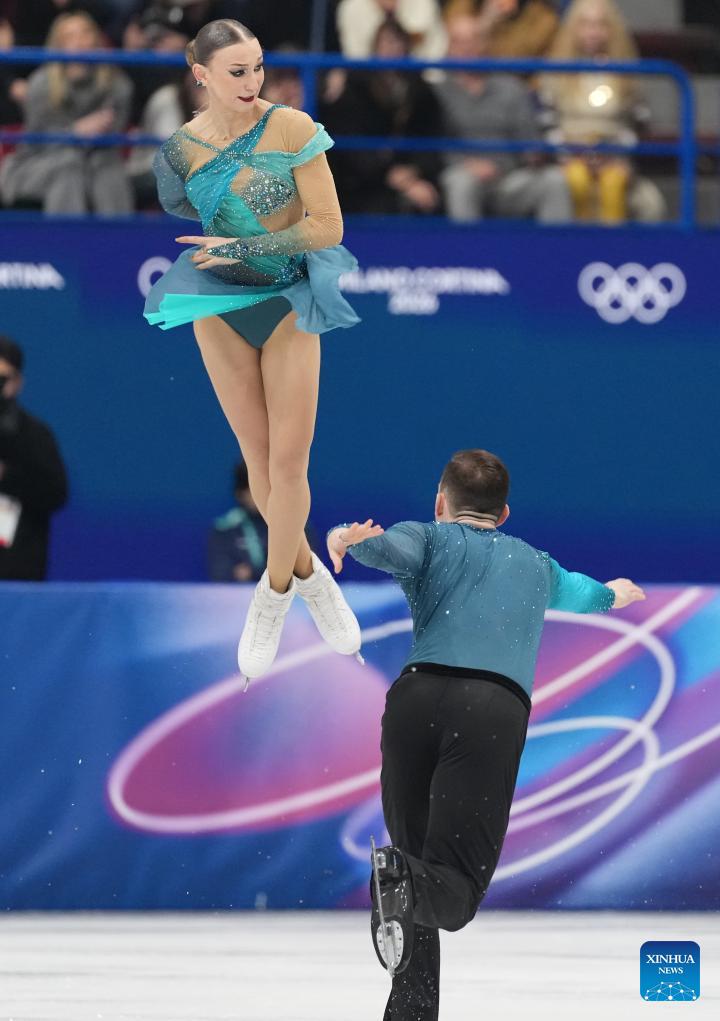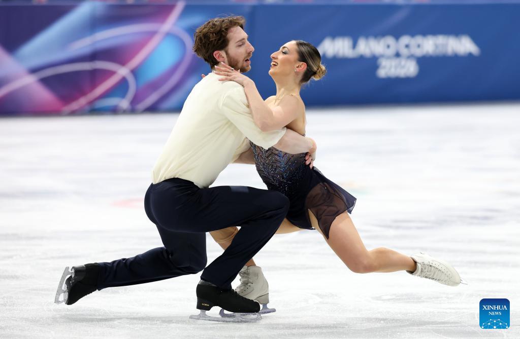 Ellie Kam (L)/Danny O'Shea of the United States perform during the figure skating team event pair skating free skating of the Milan-Cortina 2026 Olympic Winter Games in Milan, Italy, Feb. 8, 2026. (Xinhua/Xue Yuge)