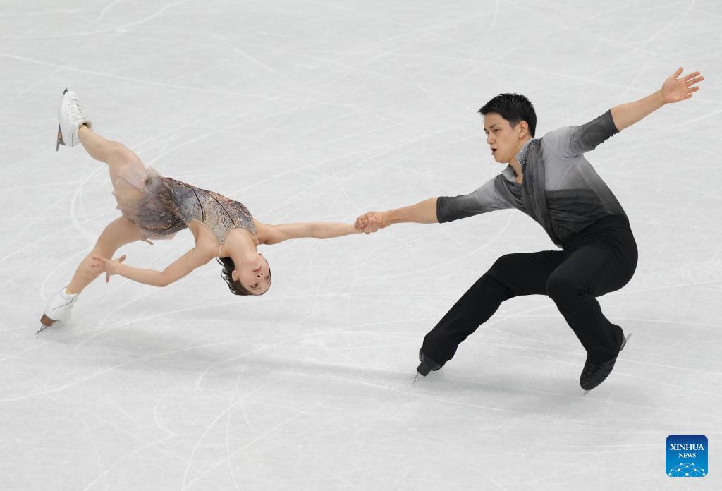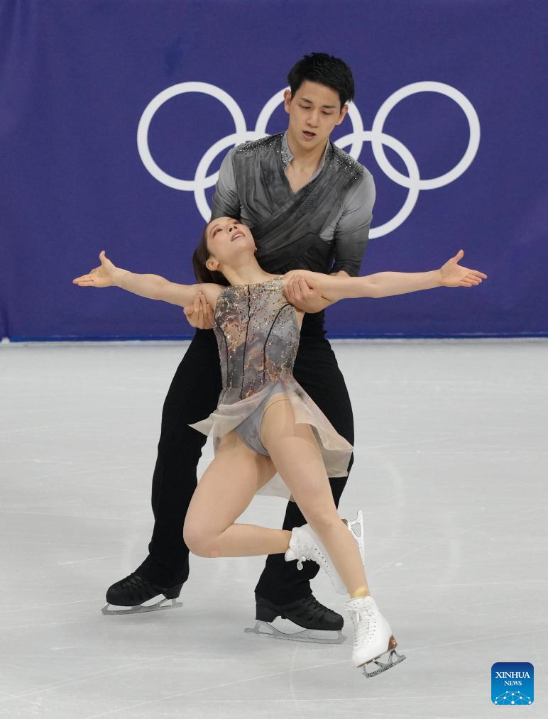 Miura Riku (L)/Kihara Ryuichi of Japan perform during the figure skating team event pair skating free skating of the Milan-Cortina 2026 Olympic Winter Games in Milan, Italy, Feb. 8, 2026. (Xinhua/Xue Yuge)