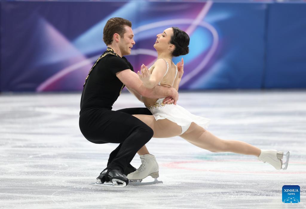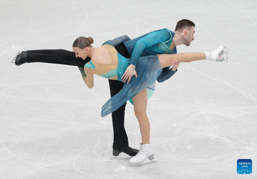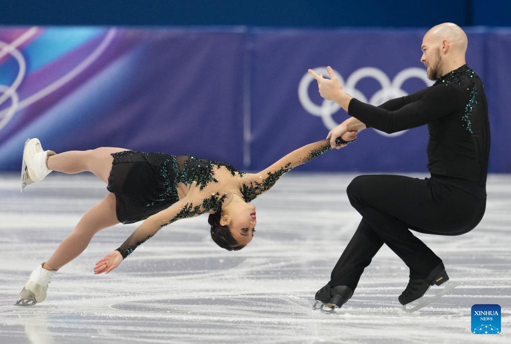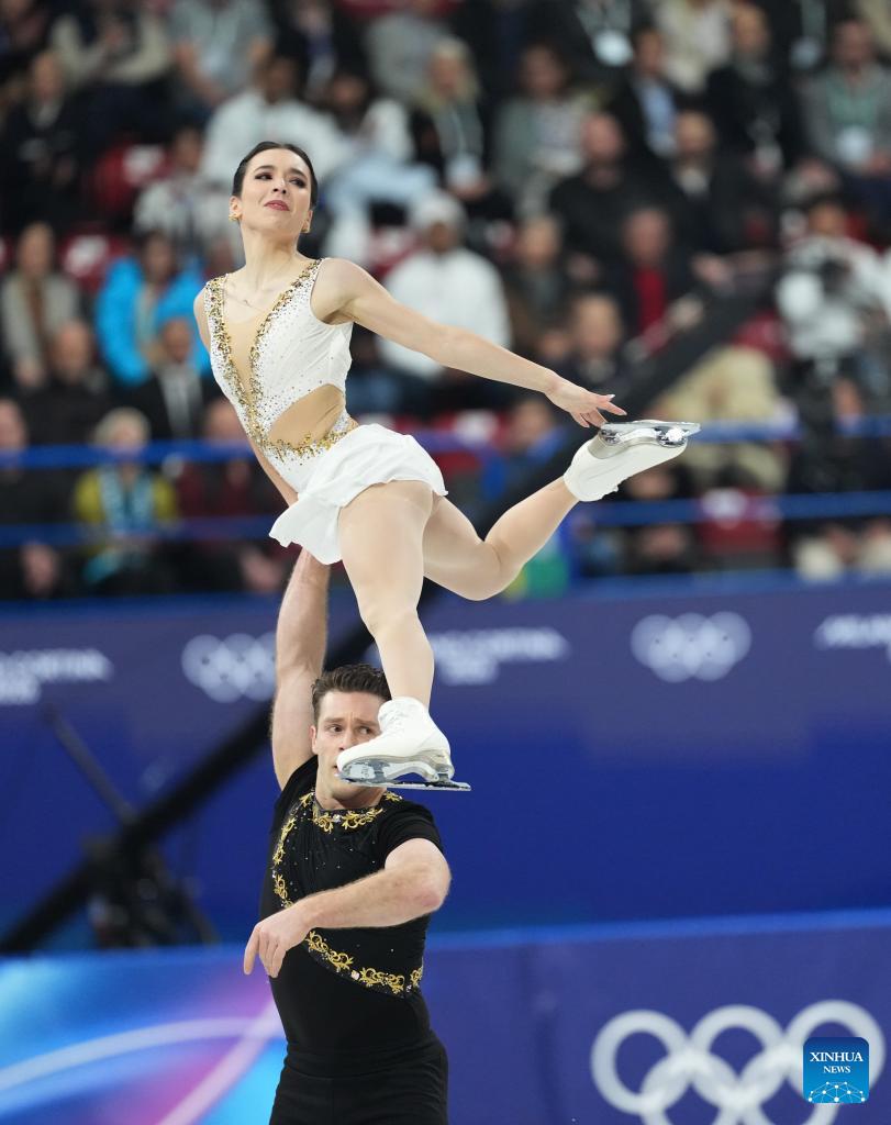 Lia Pereira (R)/Trennt Michaud of Canada compete during the free skating of pair skating for figure skating team event at the Milan-Cortina 2026 Olympic Winter Games in Milan, Italy, Feb. 8, 2026. (Xinhua/Li Ming)