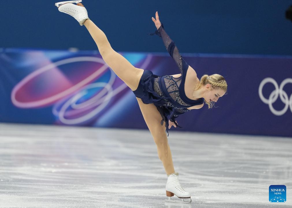 Amber Glenn of the United States performs during the figure skating team event women single skating free skating of the Milan-Cortina 2026 Olympic Winter Games in Milan, Italy, Feb. 8, 2026. (Xinhua/Xue Yuge)