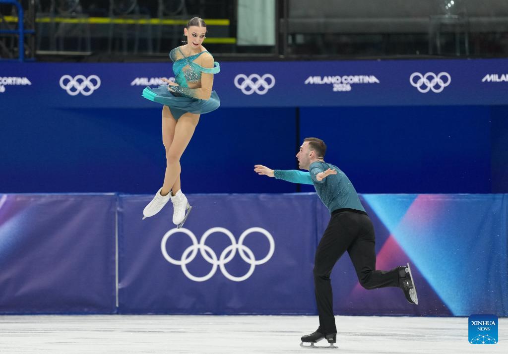 Lia Pereira (top)/Trennt Michaud of Canada perform during the figure skating team event pair skating free skating of the Milan-Cortina 2026 Olympic Winter Games in Milan, Italy, Feb. 8, 2026. (Xinhua/Xue Yuge)