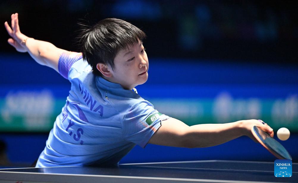 Sun Yingsha hits a return during the women's singles final between Wang Manyu of China and Sun Yingsha of China at the ITTF-ATTU Asian Cup Haikou 2026 table tennis tournament in Haikou, south China's Hainan Province, Feb. 8, 2026. (Photo: Xinhua)