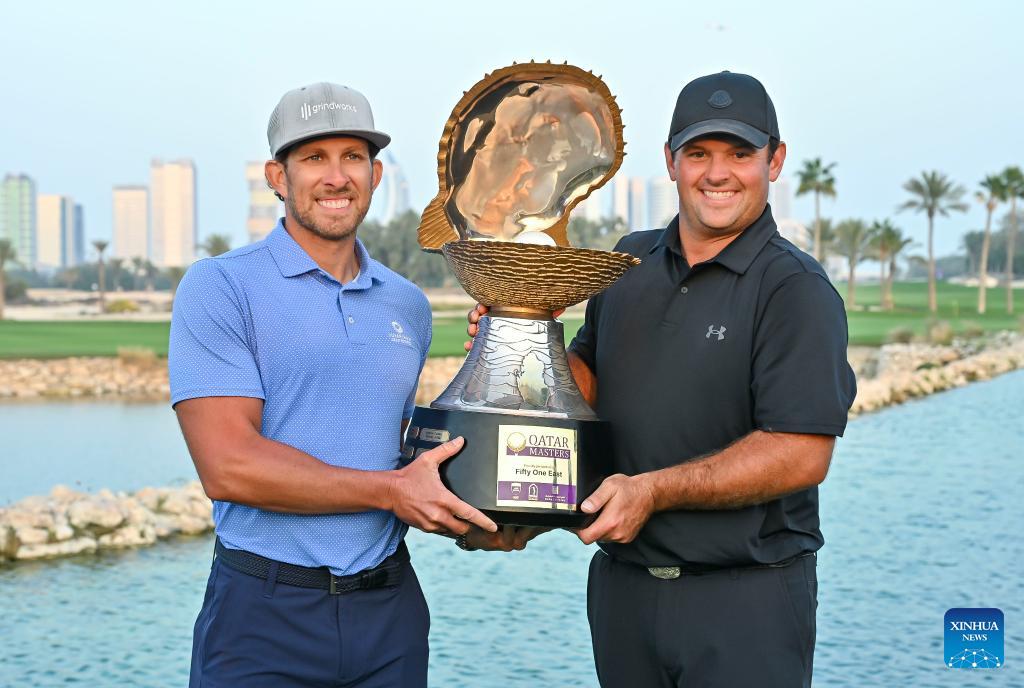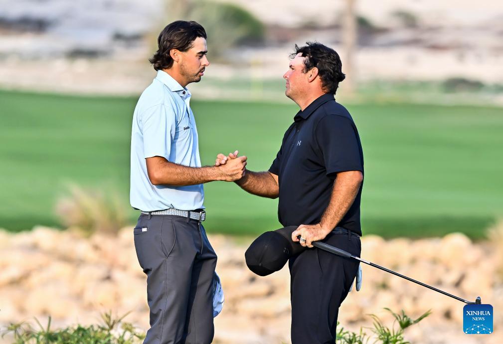 Jacob Skov Olesen (L) of Denmark congratulates Patrick Reed of the United States as the latter wins the Qatar Masters 2026 golf tournament at the Doha Golf Club in Doha, Qatar, Feb. 8, 2026. (Photo by Nikku/Xinhua)