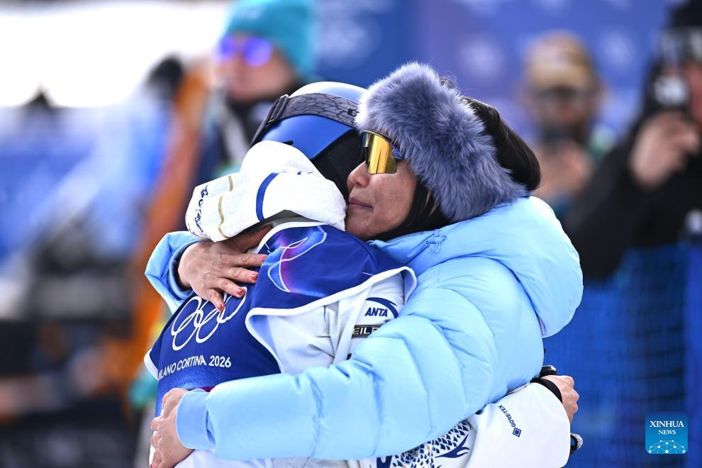 Gu Ailing (L) of China hugs her mother during the freestyle skiing women's freeski slopestyle final at the Milan-Cortina 2026 Olympic Winter Games in Livigno, Italy, Feb. 9, 2026. (Xinhua/Zhang Hongxiang)