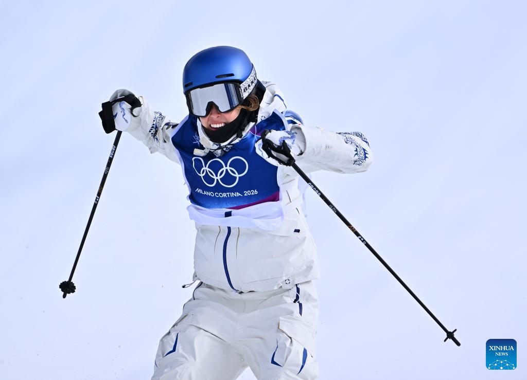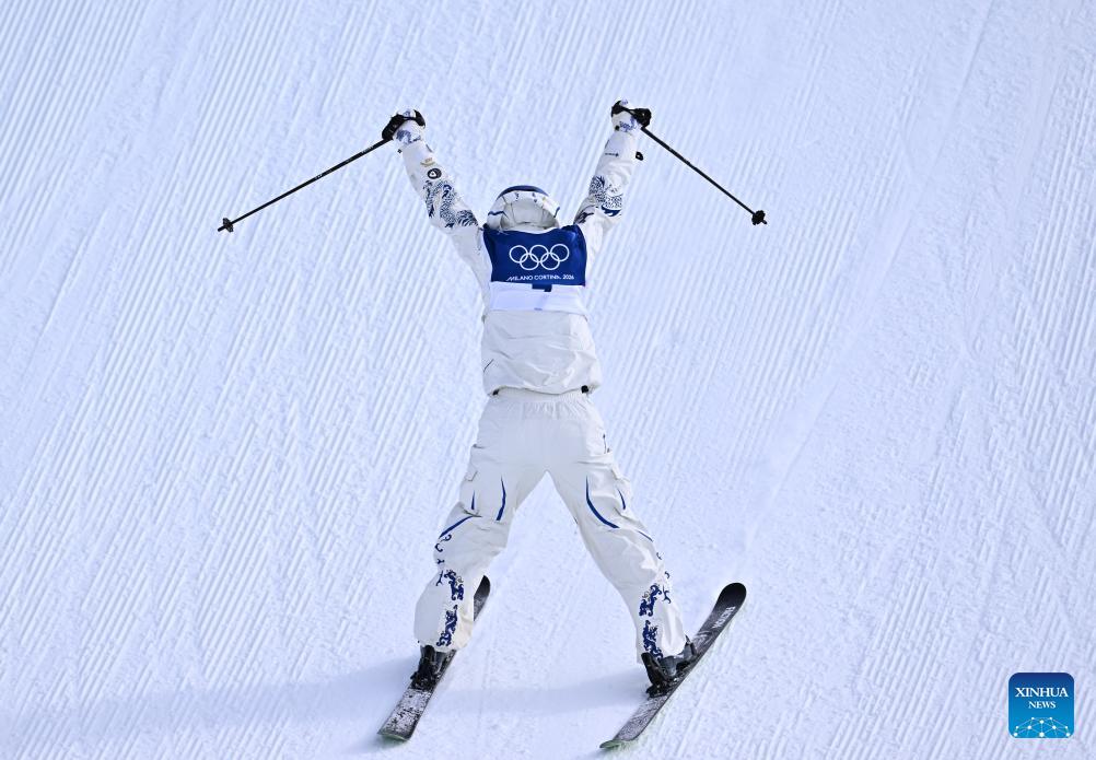 Liu Mengting of China reacts during the freestyle skiing women's freeski slopestyle final at the Milan-Cortina 2026 Olympic Winter Games in Livigno, Italy, Feb. 9, 2026. (Xinhua/Zhang Hongxiang)