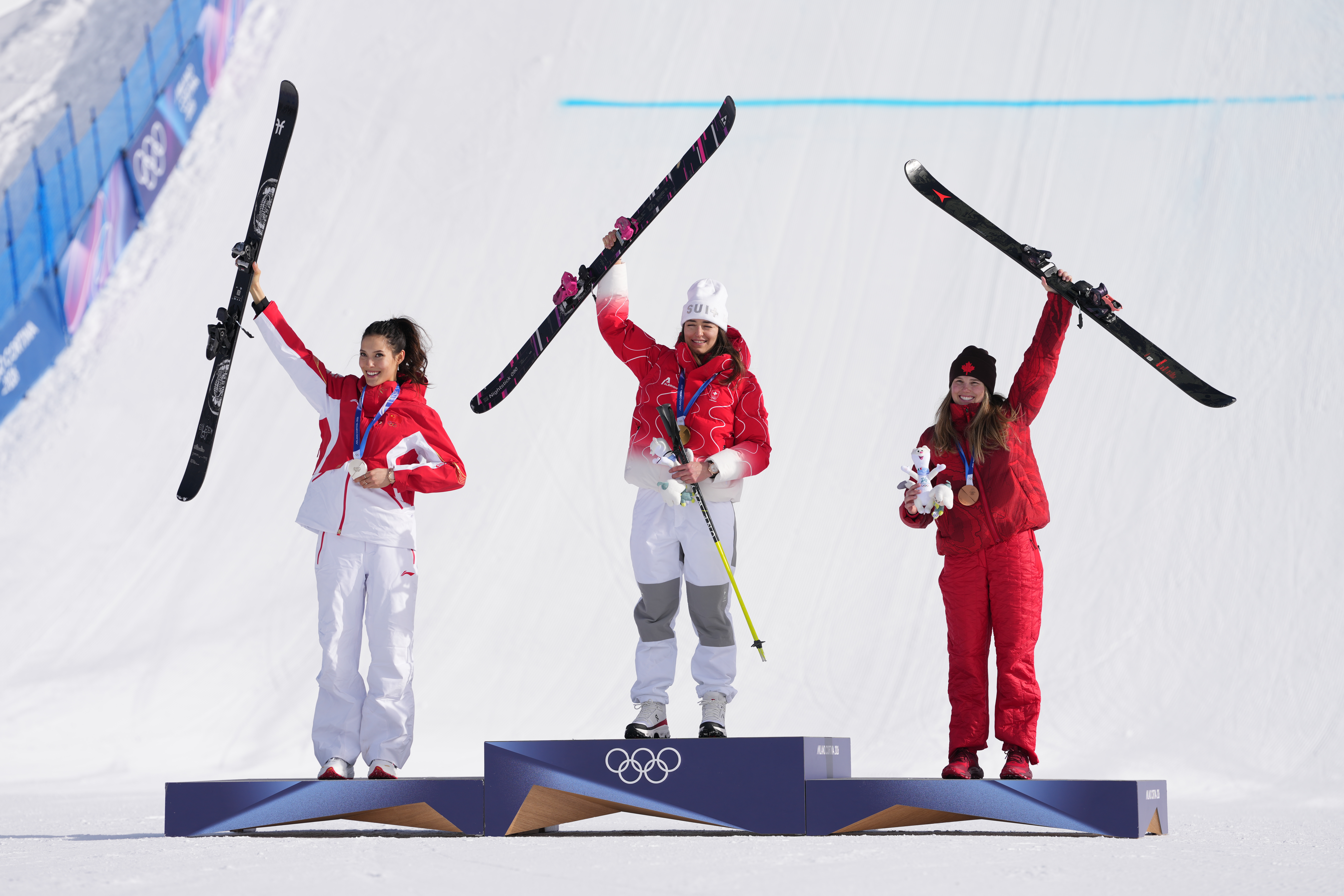 (From L) Silver medallist China's Gu Ailing, gold medallist Switzerland's Mathilde Gremaud and bronze medallist Canada's Megan Oldham celebrate on the podium after the freestyle skiing women's freeski slopestyle final during the Milano Cortina 2026 Winter Olympic Games at Livigno Snow Park-Slopestyle, in Livigno (Valtellina), on February 9, 2026. (Photo: People's Daily)