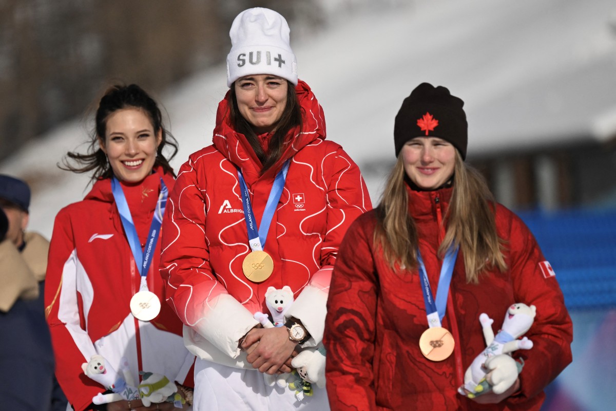 (From L) Silver medallist China's Gu Ailing Eileen, gold medallist Switzerland's Mathilde Gremaud and bronze medallist Canada's Megan Oldham pose on the podium after the freestyle skiing women's freeski slopestyle final during the Milano Cortina 2026 Winter Olympic Games at Livigno Snow Park-Slopestyle, in Livigno (Valtellina), on February 9, 2026. (Photo: AFP)