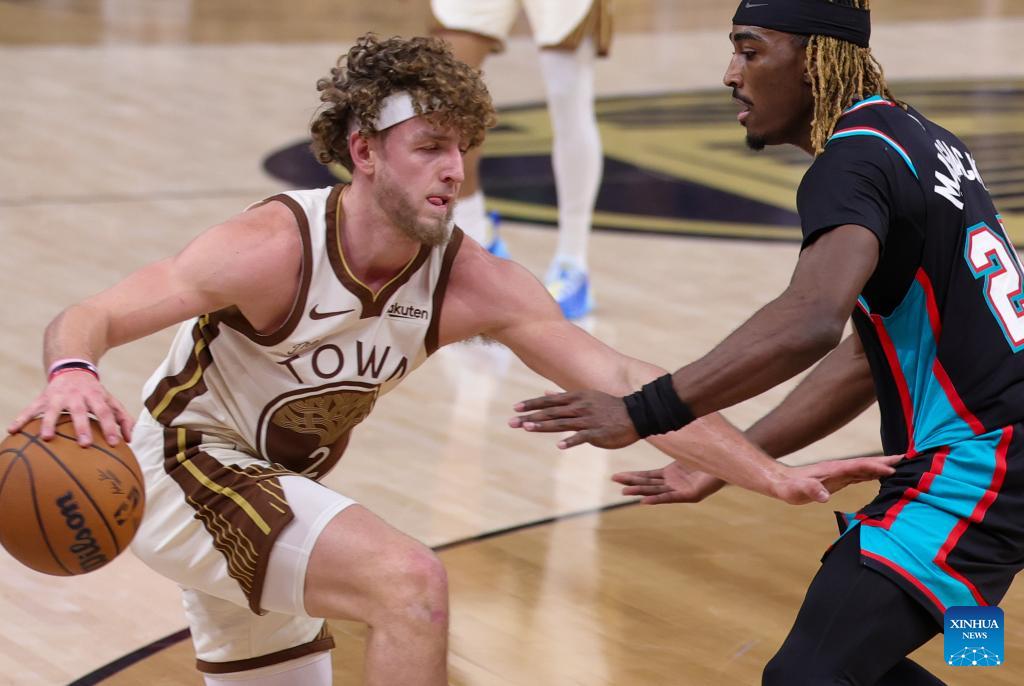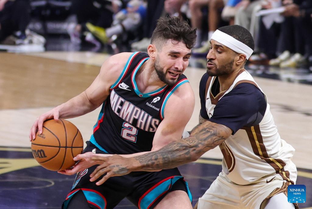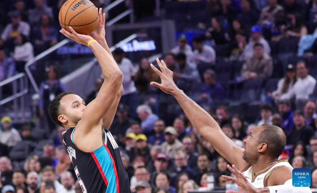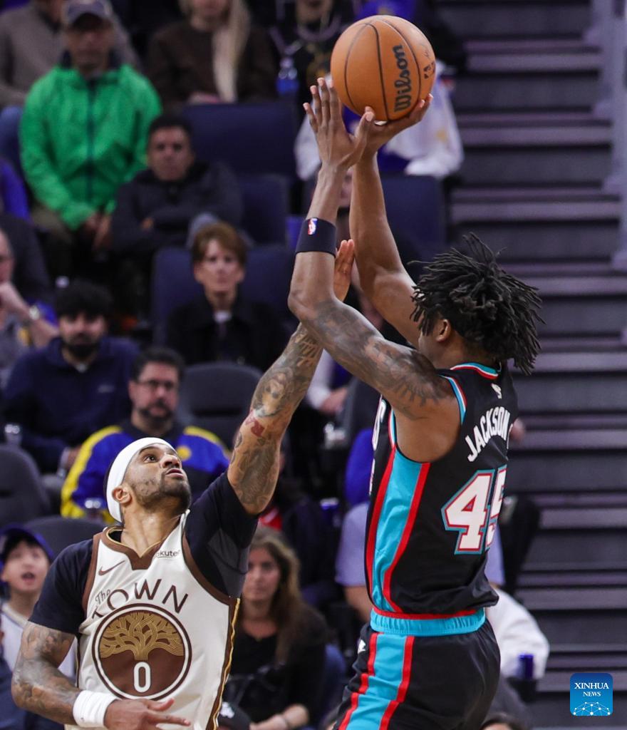 Kyle Anderson (L) of Memphis Grizzlies shoots during the 2025-2026 NBA regular season basketball game between Golden State Warriors and Memphis Grizzlies in San Francisco, the United States, Feb. 9, 2026. (Photo by Arthur Dong/Xinhua)