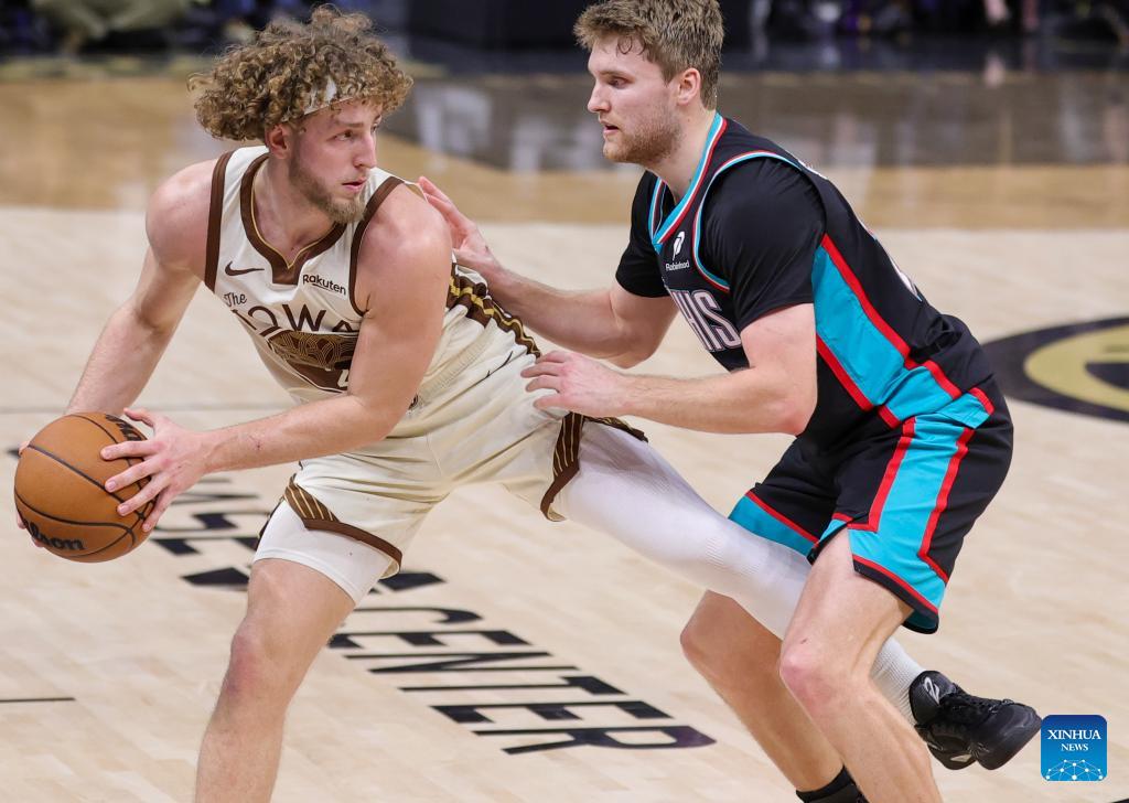 Brandin Podziemski (L) of Golden State Warriors vies with Cam Spencer of Memphis Grizzlies during the 2025-2026 NBA regular season basketball game between Golden State Warriors and Memphis Grizzlies in San Francisco, the United States, Feb. 9, 2026. (Photo by Arthur Dong/Xinhua)