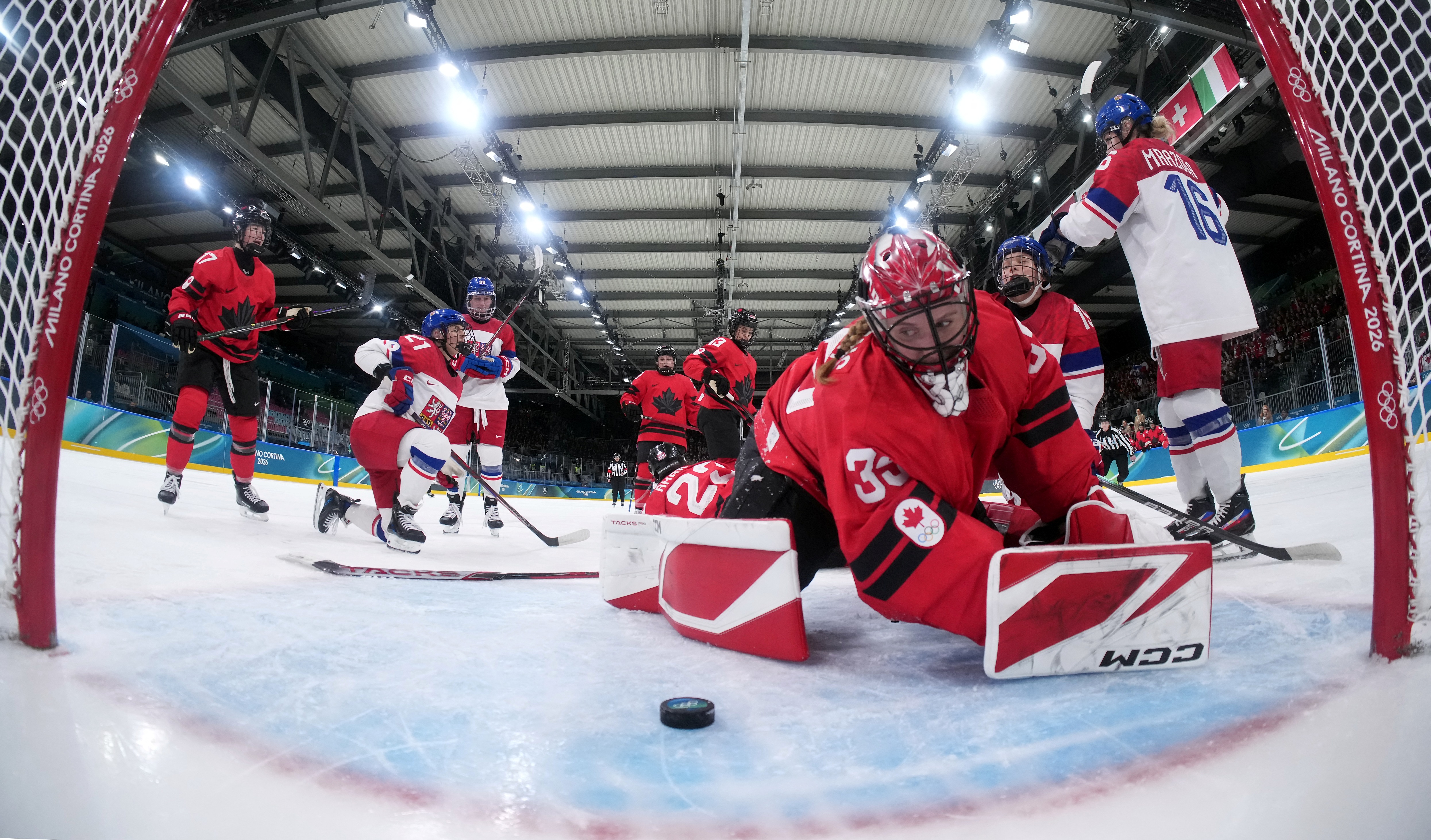 Canada's #35 Ann-Renee Desbiens looks at the puck after Czech Republic's 5-1 goal during the women's preliminary round Group A Ice Hockey match between Canada and Czech Republic at the Milano Rho Ice Hockey Arena at the Milano Cortina 2026 Winter Olympic Games in Milan, on February 9, 2026. (Photo: AFP)