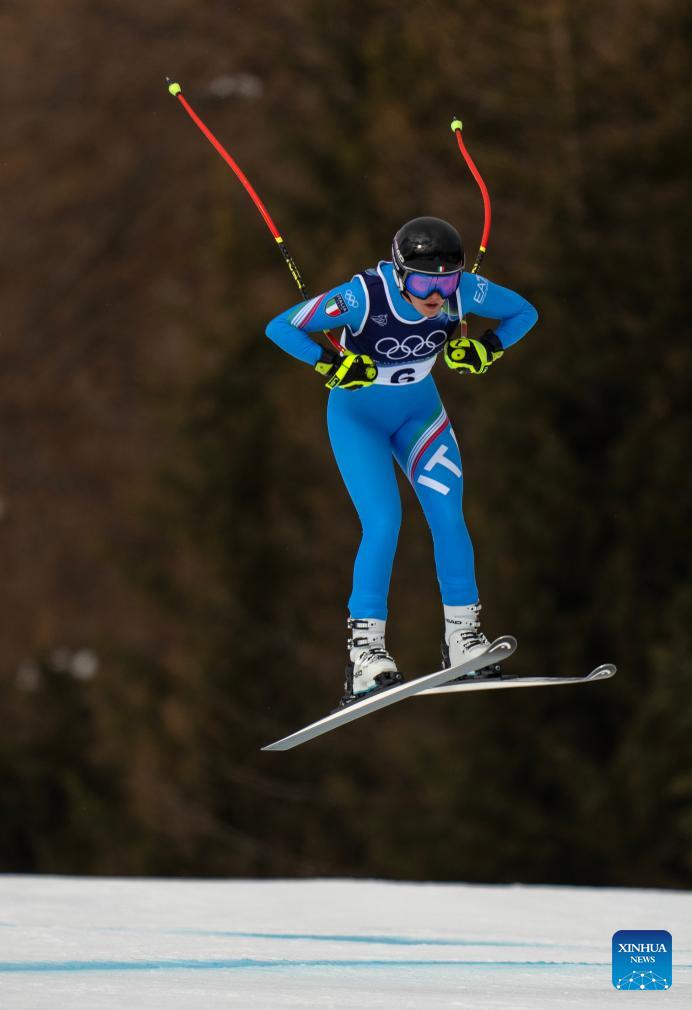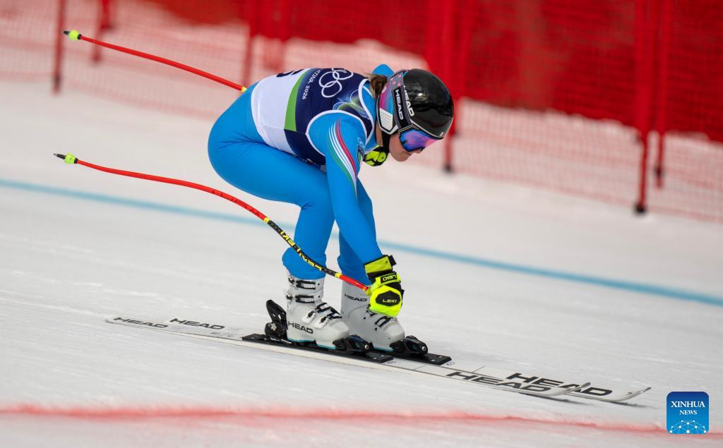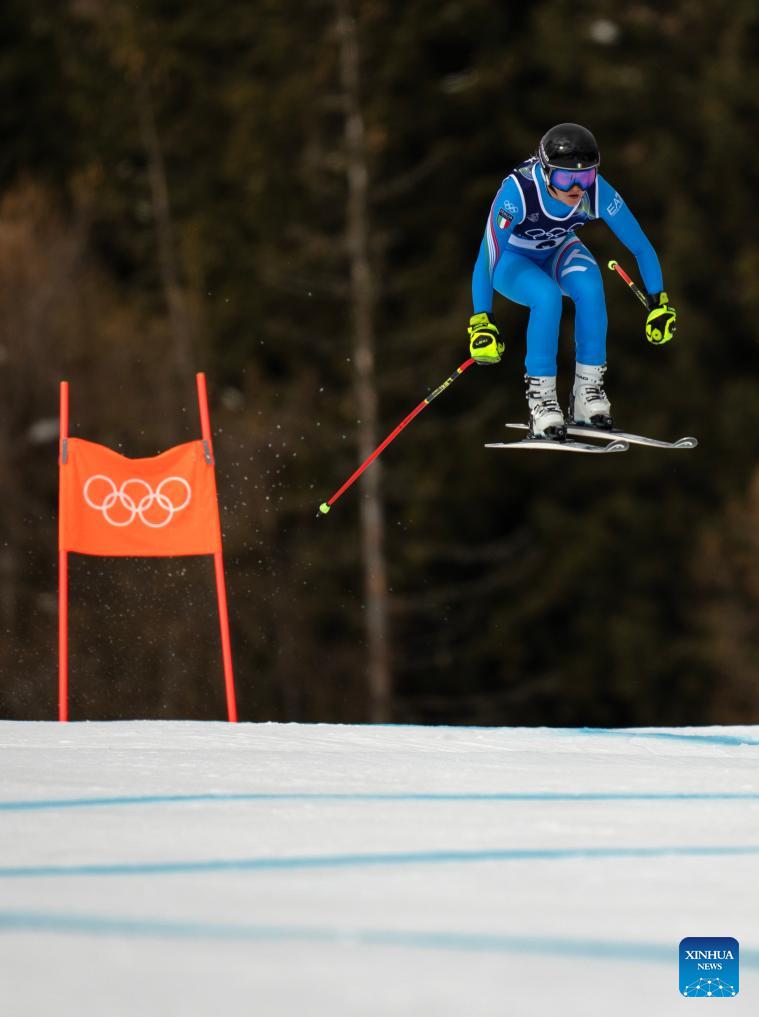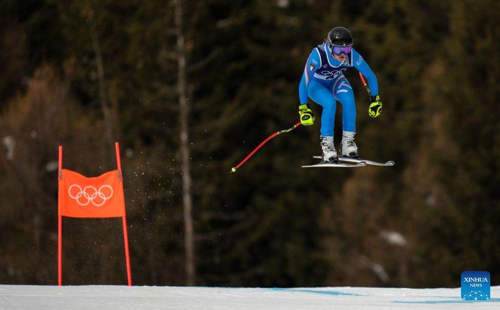 Laura Pirovano of Italy competes during the downhill race of the alpine skiing women's team combined at the Milan-Cortina 2026 Olympic Winter Games in Cortina, Italy, Feb. 10, 2026. (Xinhua/Fei Maohua)