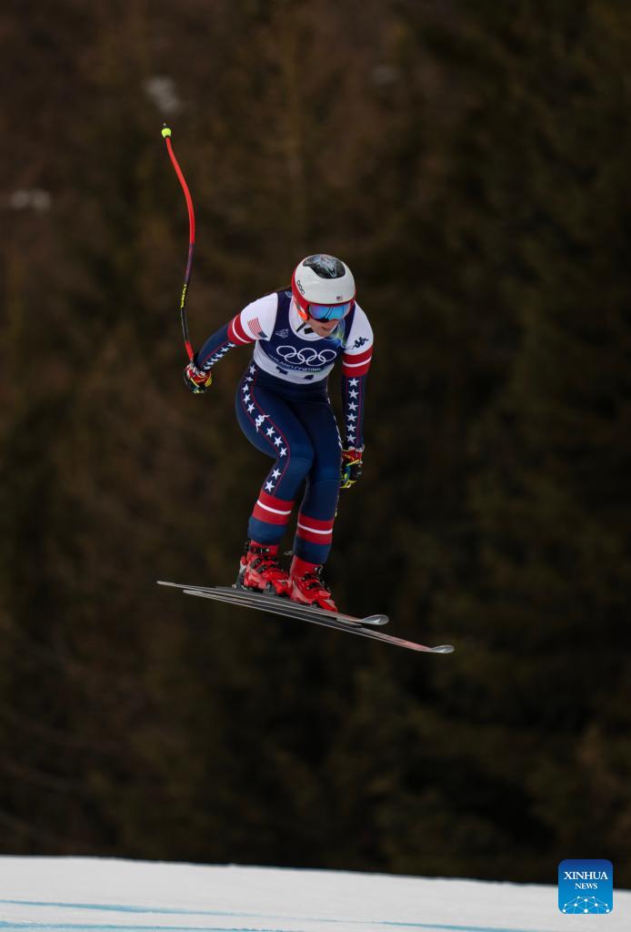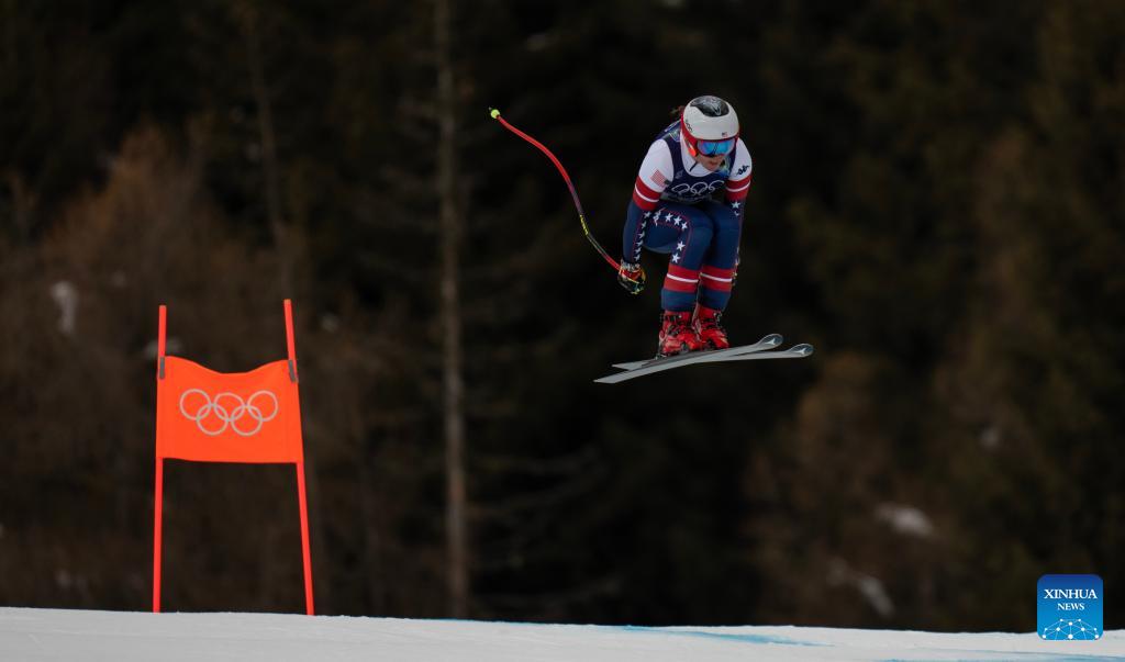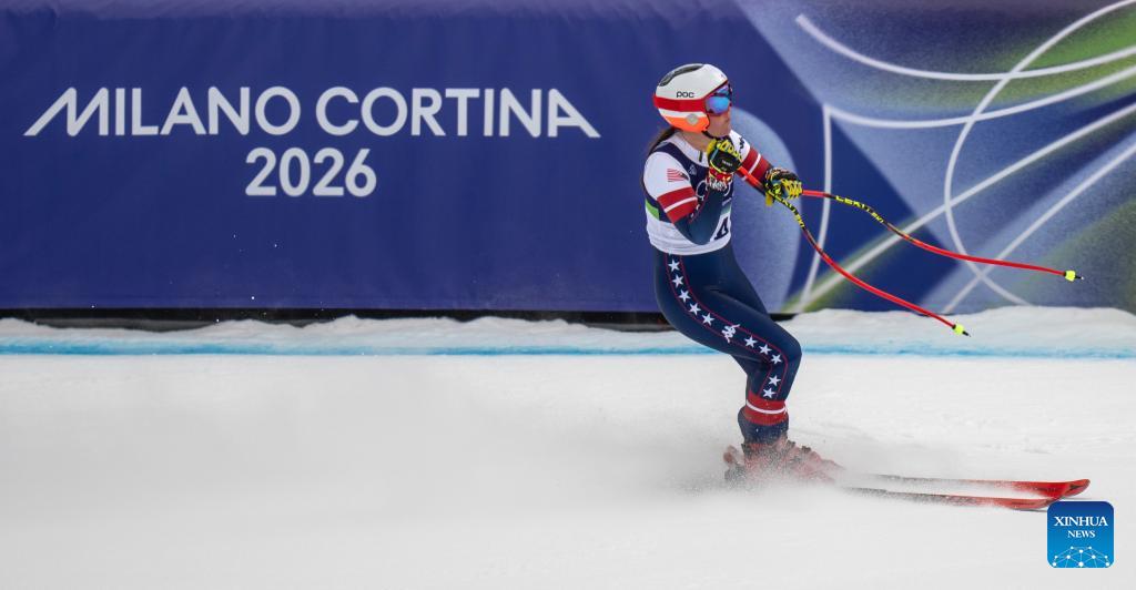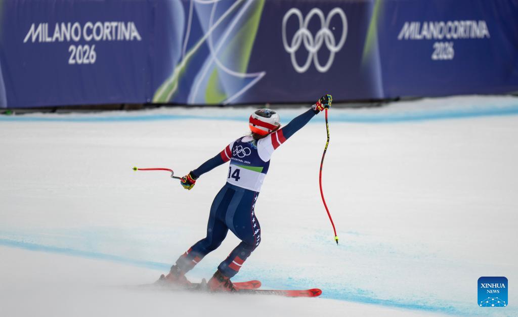 Breezy Johnson of the United States competes during the downhill race of the alpine skiing women's team combined at the Milan-Cortina 2026 Olympic Winter Games in Cortina, Italy, Feb. 10, 2026. (Xinhua/Fei Maohua)
