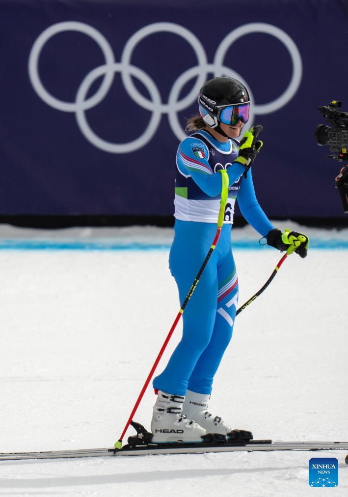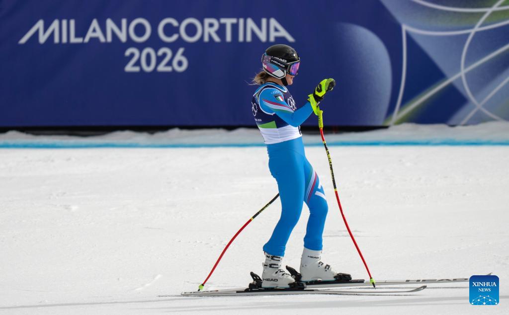 Laura Pirovano of Italy reacts after the downhill race of the alpine skiing women's team combined at the Milan-Cortina 2026 Olympic Winter Games in Cortina, Italy, Feb. 10, 2026. (Xinhua/Fei Maohua)