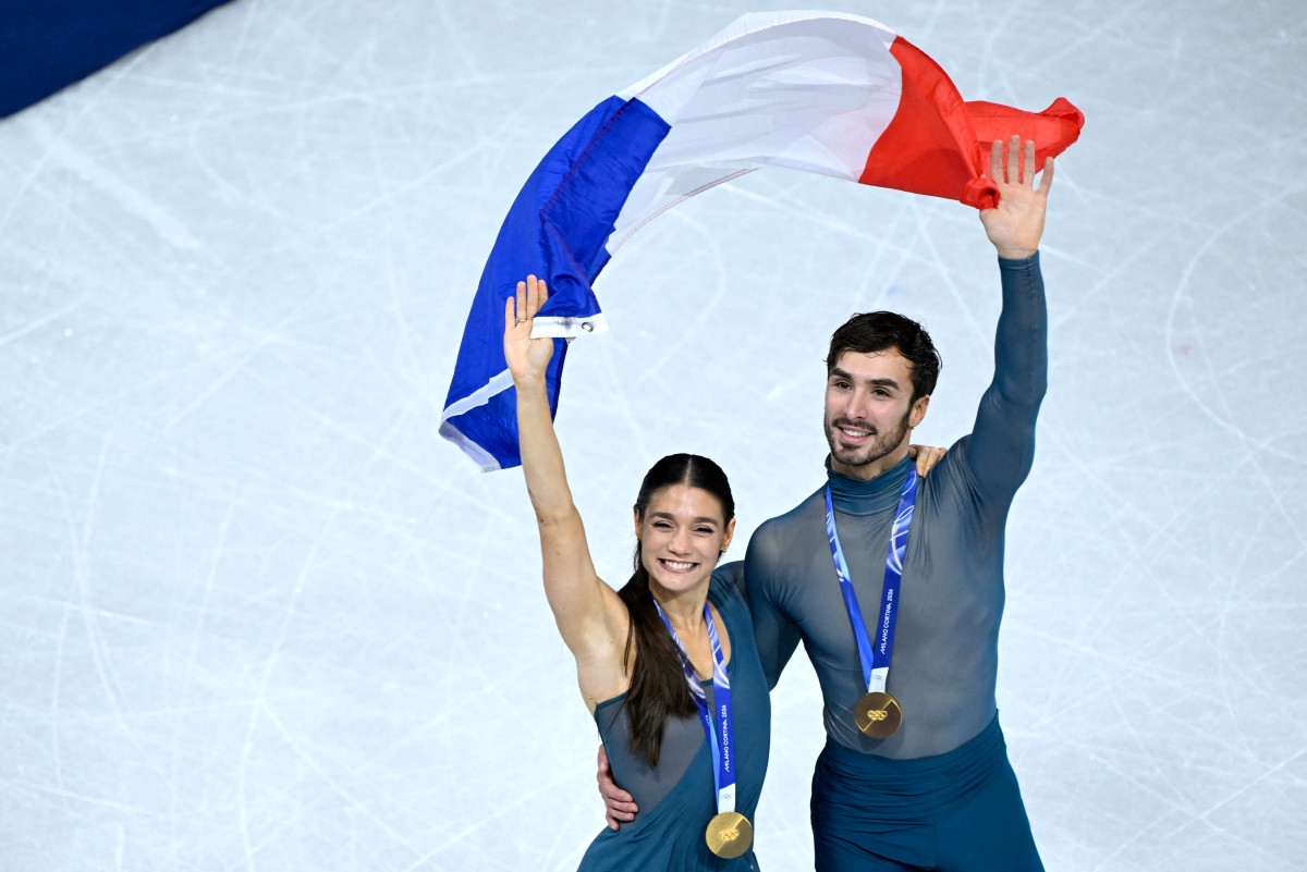 Gold medallists France's Laurence Fournier Beaudry and Guillaume Cizeron wave their country's flag after the victory ceremony of the figure skating ice dance-free dance final during the Milano Cortina 2026 Winter Olympic Games at Milano Ice Skating Arena in Milan on February 11, 2026. (Photo: AFP)