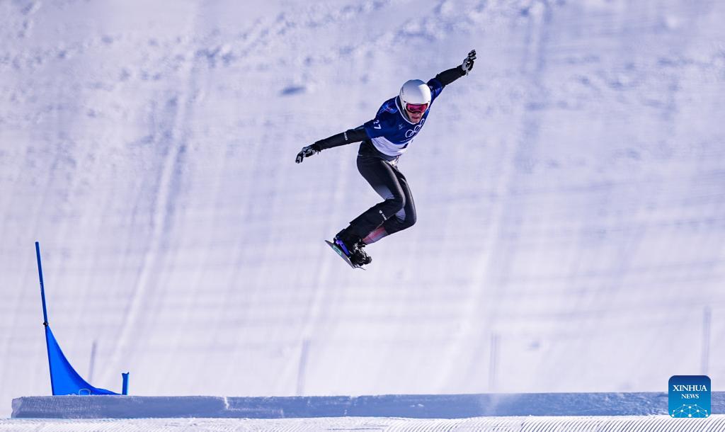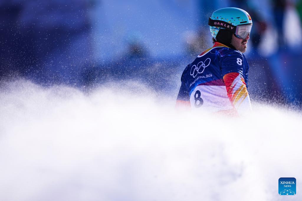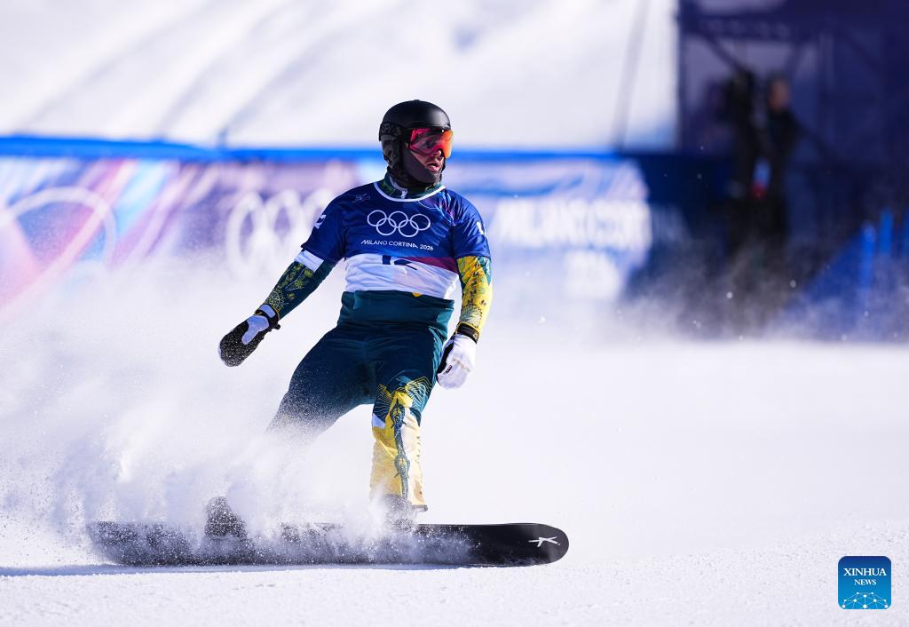 Adam Lambert of Australia competes during the snowboard men's cross seeding run at the Milan-Cortina 2026 Olympic Winter Games in Livigno, Italy, Feb. 12, 2026. (Xinhua/Wu Huiwo)