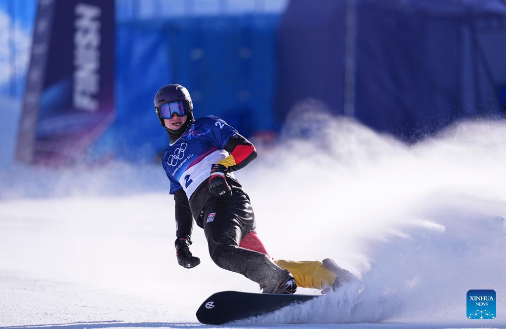 Leon Ulbricht of Germany competes during the snowboard men's cross seeding run at the Milan-Cortina 2026 Olympic Winter Games in Livigno, Italy, Feb. 12, 2026. (Xinhua/Wu Huiwo)