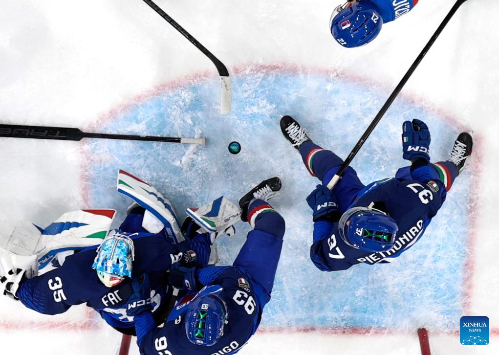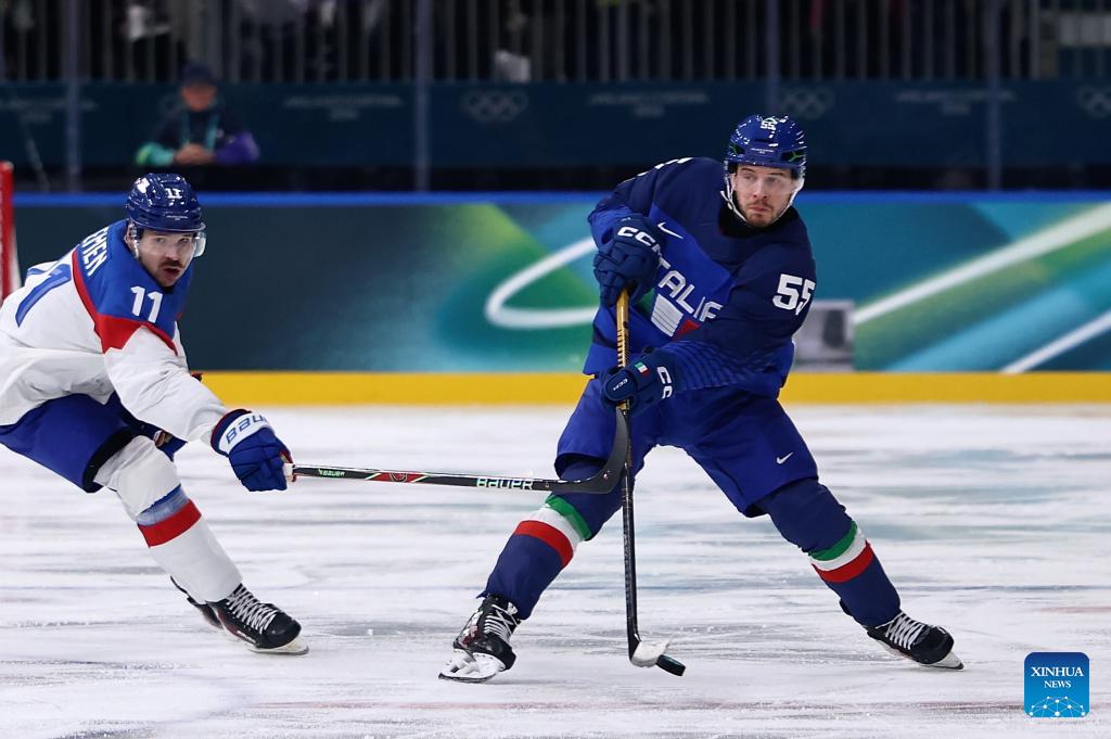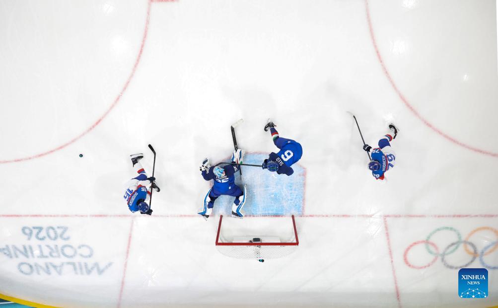 Players of both teams compete during the ice hockey men's preliminary round group B match between Italy and Slovakia at the Milan-Cortina 2026 Olympic Winter Games in Milan, Italy, Feb. 13, 2026. (Xinhua/Wang Kaiyan)