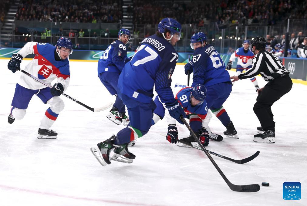 Matus Sukel (C) of Slovakia competes against Gregory di Tomaso (3rd L) of Italy during the ice hockey men's preliminary round group B match between Italy and Slovakia at the Milan-Cortina 2026 Olympic Winter Games in Milan, Italy, Feb. 13, 2026. (Xinhua/Wang Kaiyan)