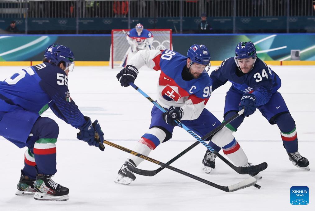 Tomas Tatar (C) of Slovakia vies with Tommy Purdeller (R) and Luca Zanatta of Italy during the ice hockey men's preliminary round group B match between Italy and Slovakia at the Milan-Cortina 2026 Olympic Winter Games in Milan, Italy, Feb. 13, 2026. (Xinhua/Wang Kaiyan)
