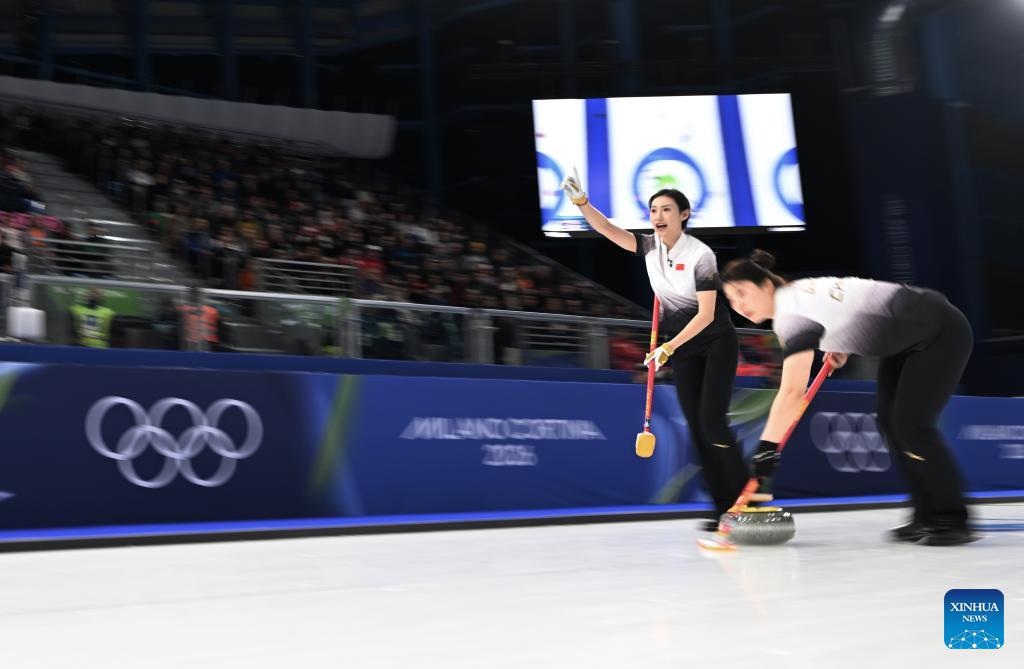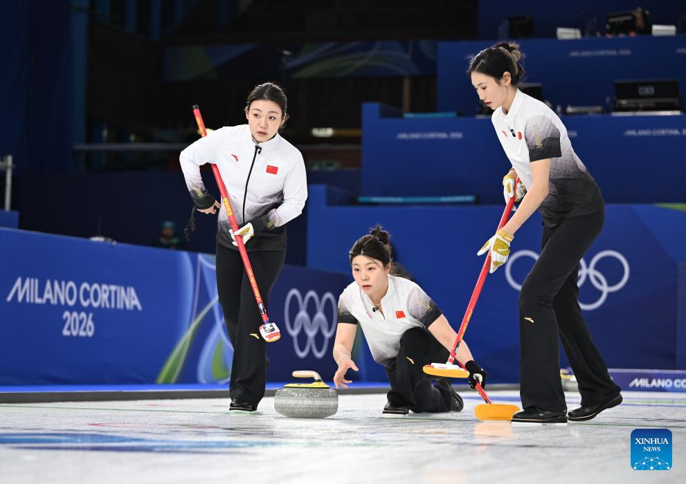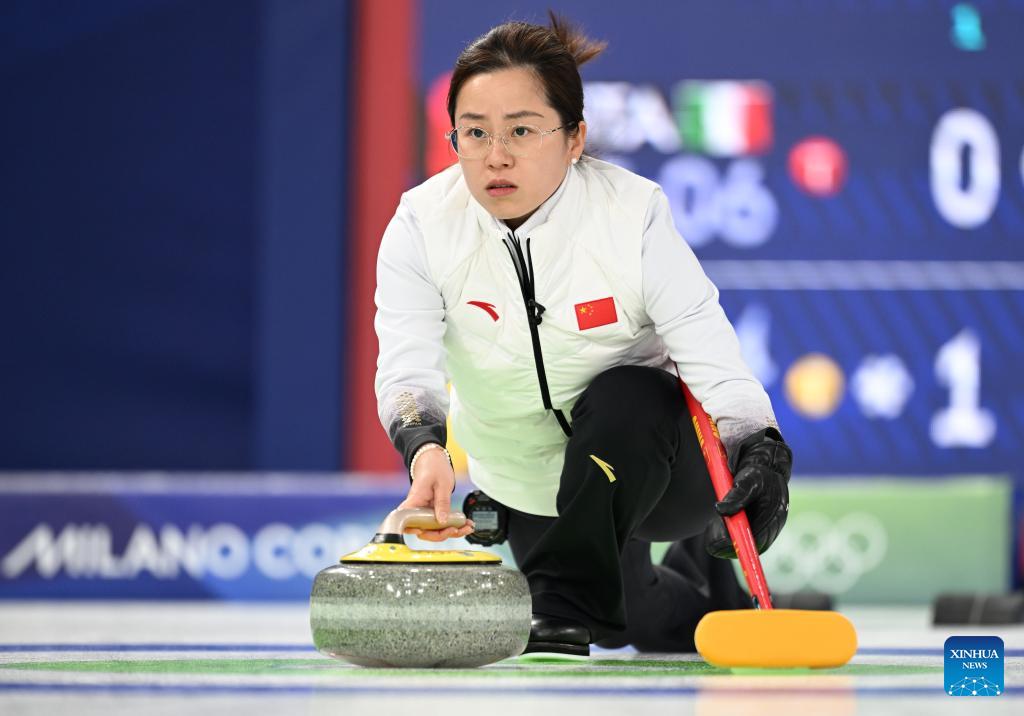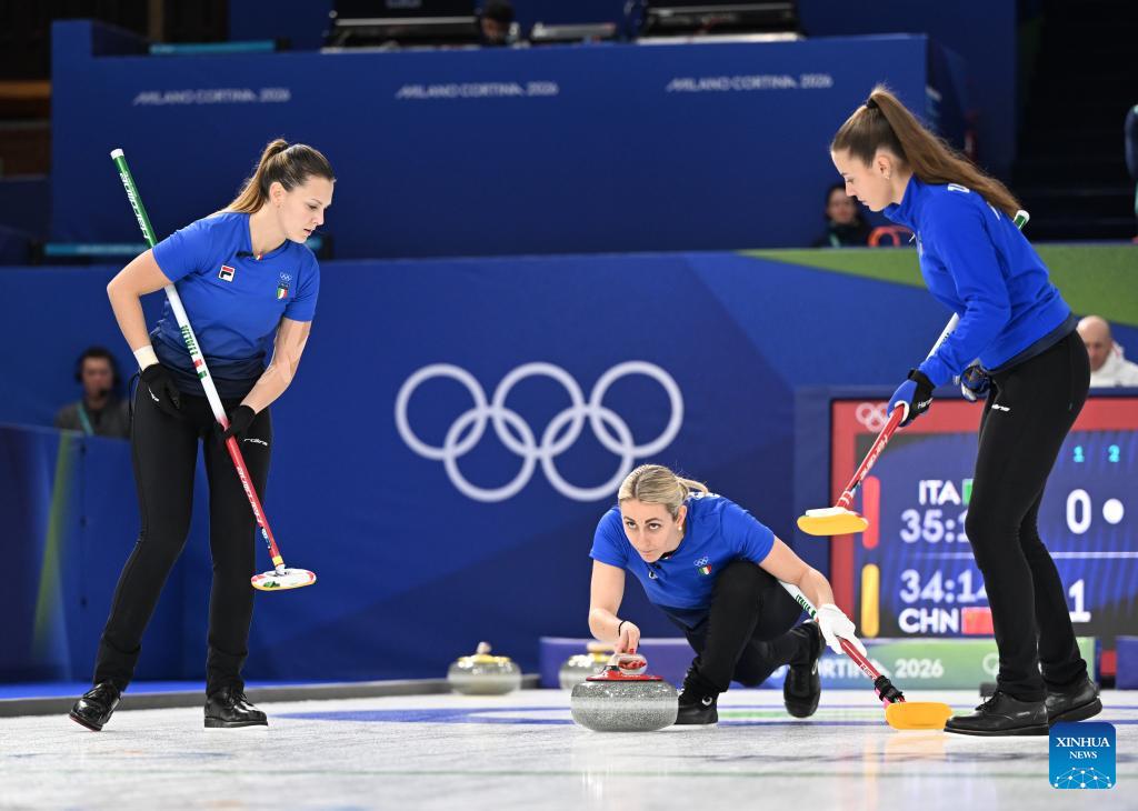 Dong Ziqi (C) of China competes during the curling women round robin session 4 match between China and Italy at the 2026 Milan-Cortina Winter Olympics in Cortina, Italy, Feb. 14, 2026. (Xinhua/Lian Yi)